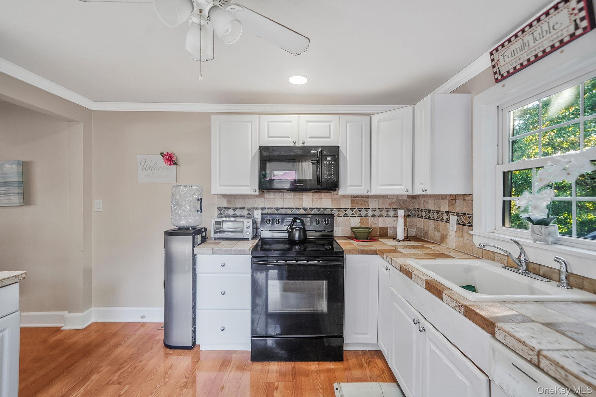 - Kitchen with tasteful backsplash, black appliances, white cabinetry, crown molding, and light wood finished floors