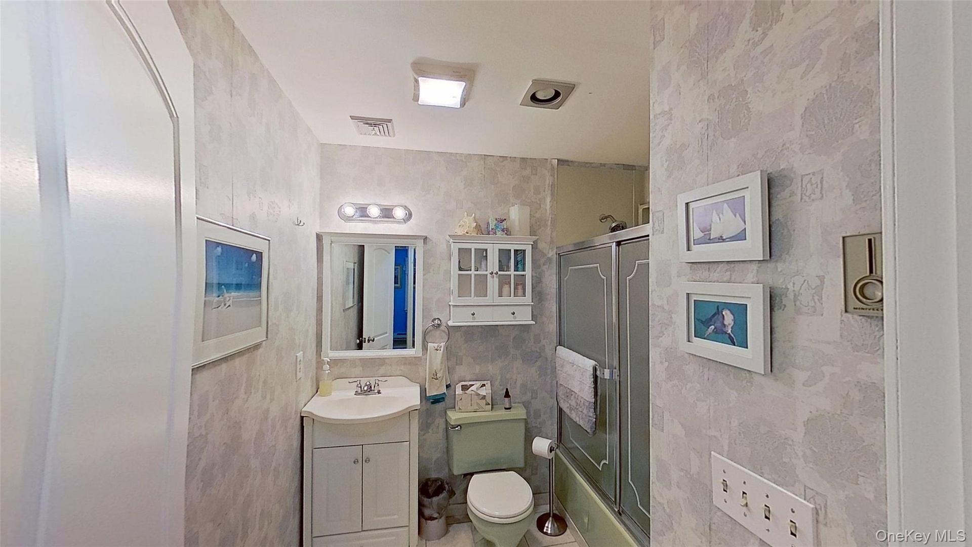 - Bathroom featuring vanity and enclosed tub / shower combo