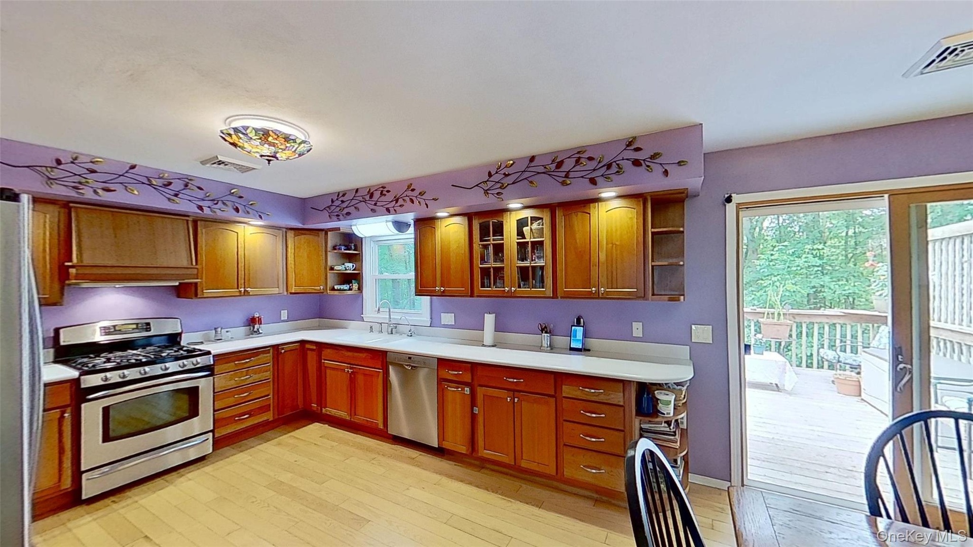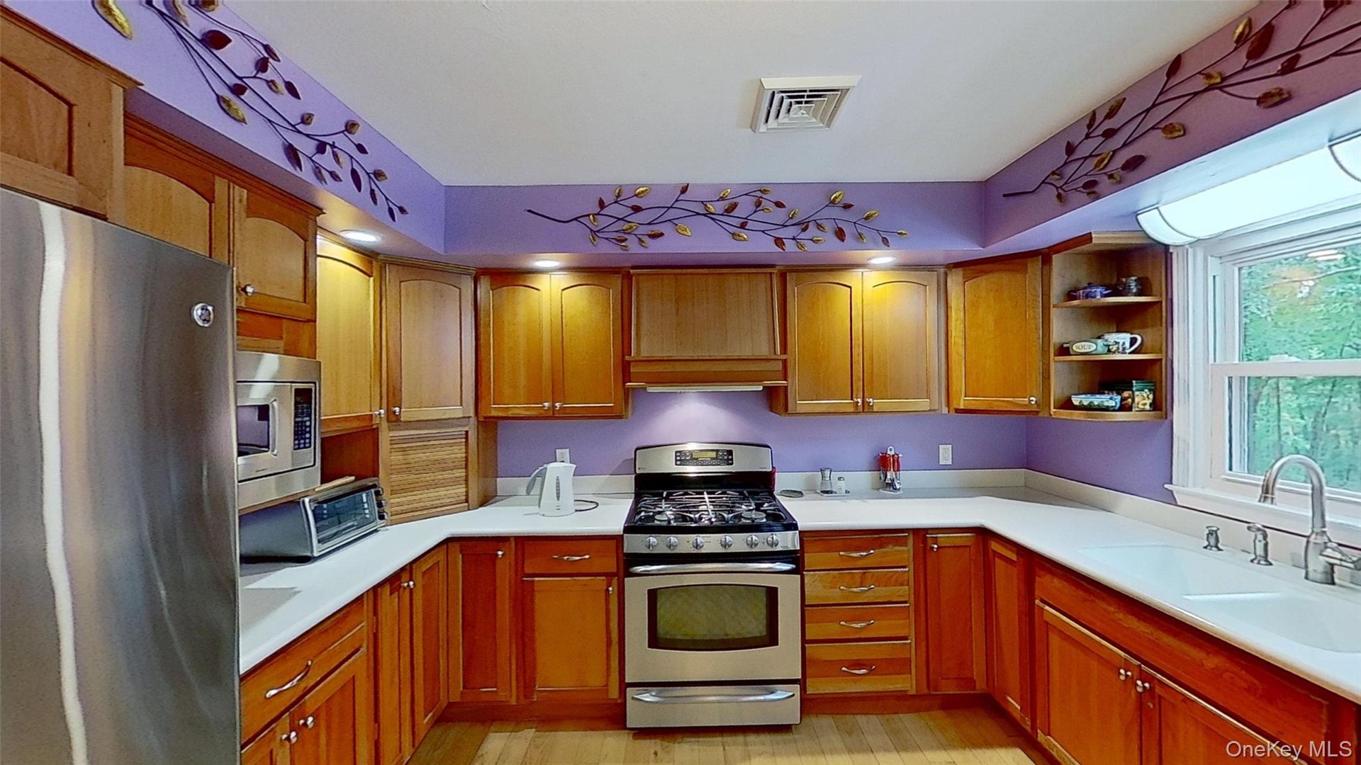 - Kitchen featuring stainless steel appliances, light countertops, and brown cabinets