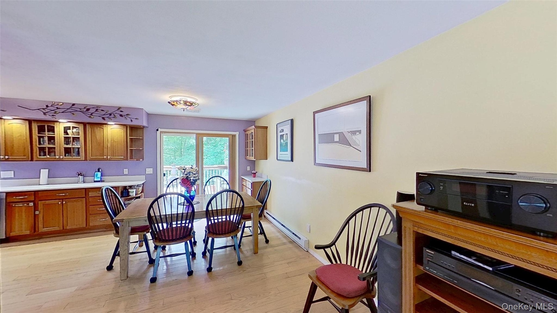 - Dining space featuring a baseboard radiator and light wood finished floors
