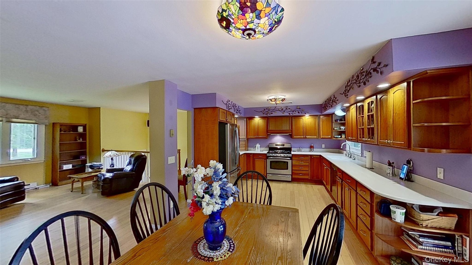 - Kitchen with stainless steel appliances, open shelves, light countertops, and light wood-style floors