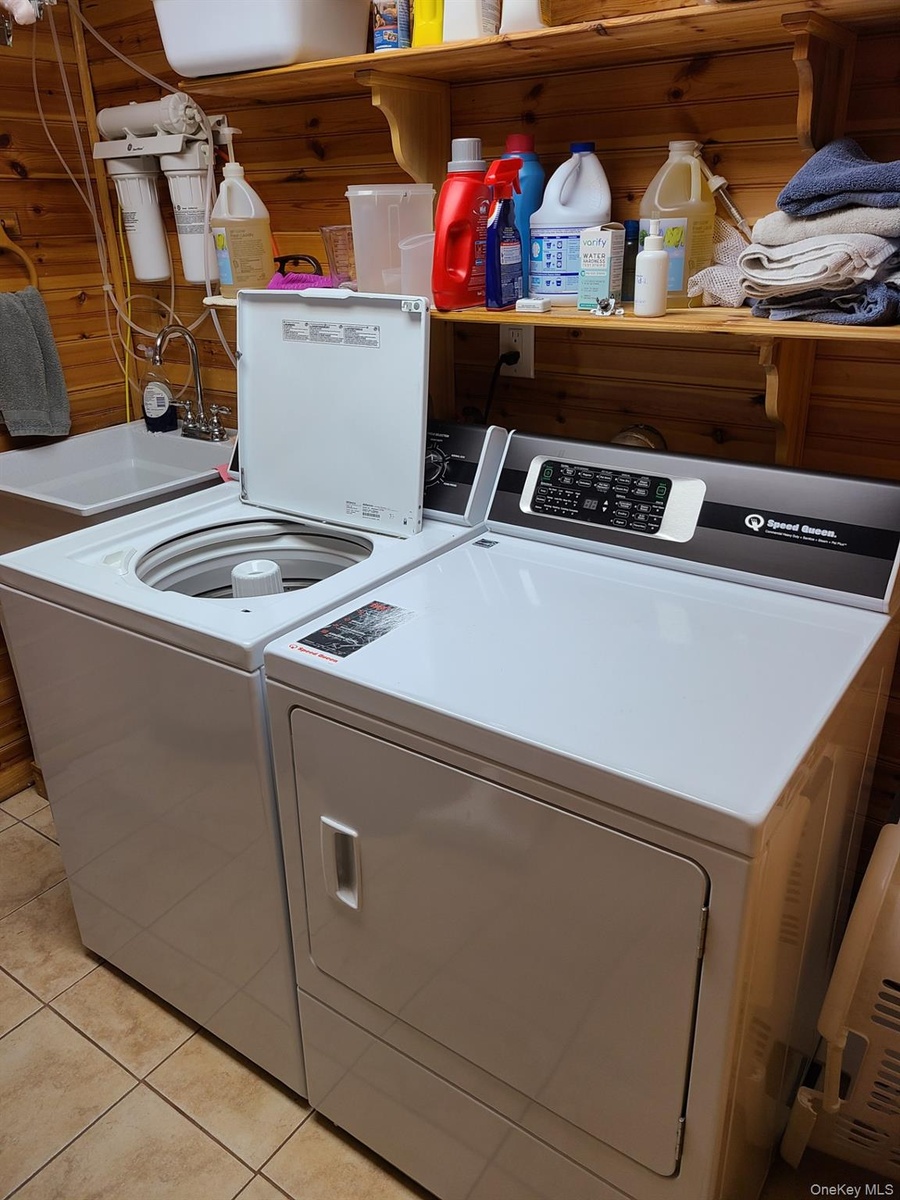 - Laundry room featuring washer and clothes dryer and light tile patterned flooring