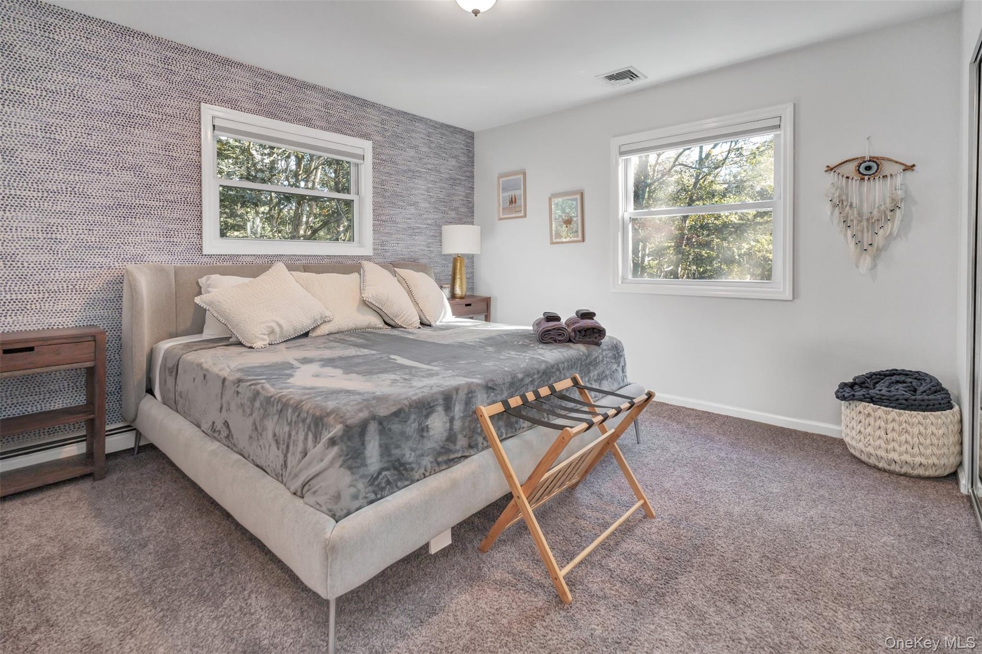 - Upstairs Guest Bedroom featuring an accent wall, multiple windows, and wallpapered walls