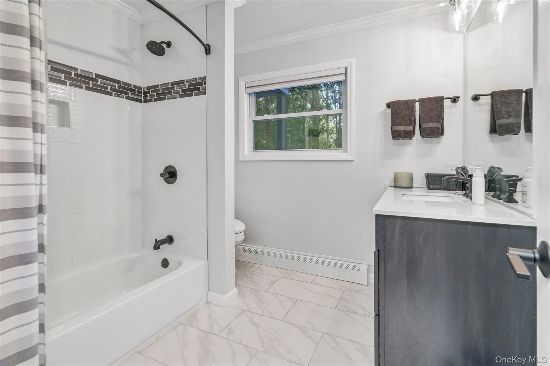 - Primary Bathroom with shower / bath combo, vanity, ornamental molding, a baseboard heating unit, and light marble finish flooring