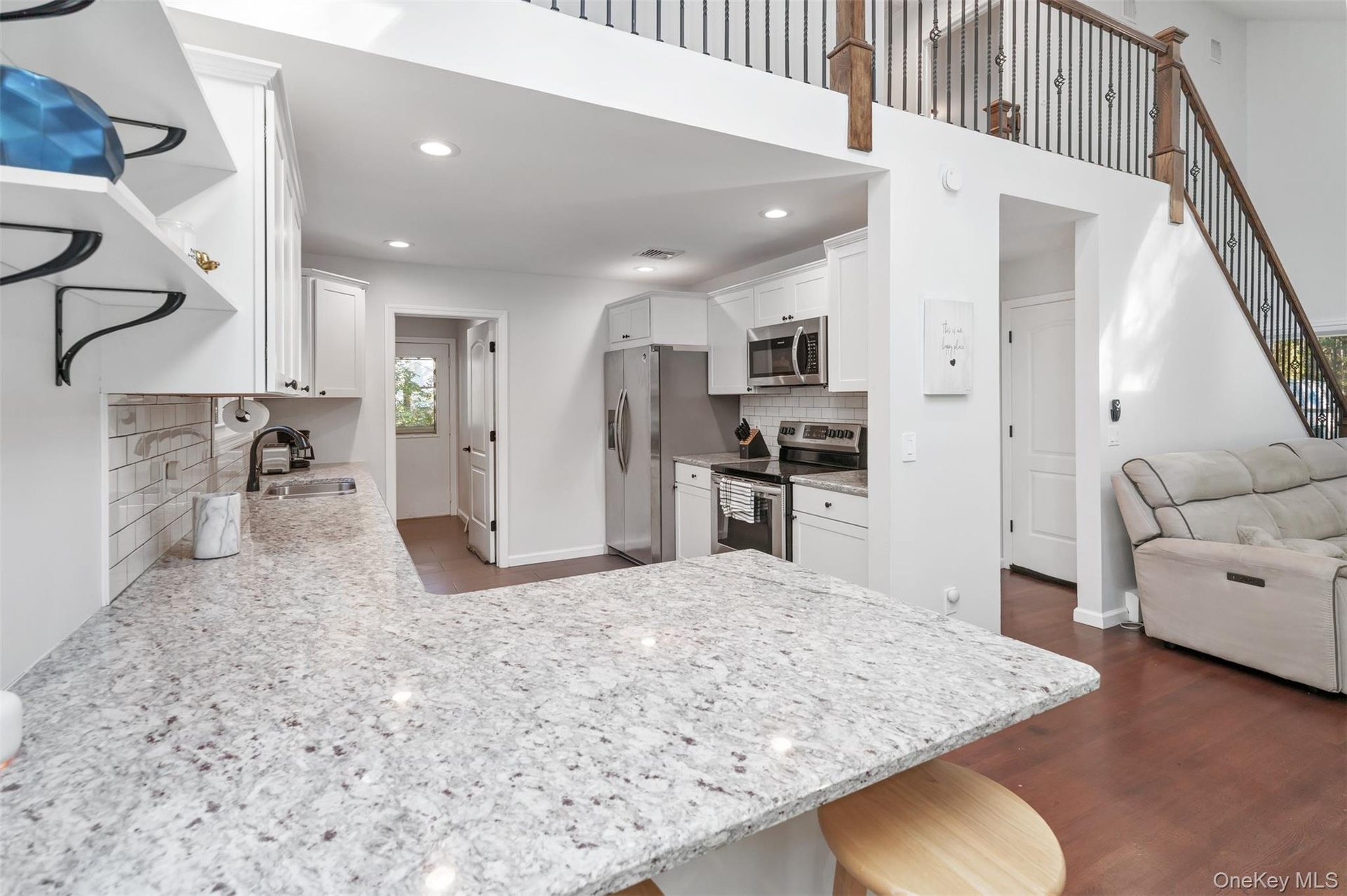 - Kitchen with backsplash, white cabinets, dark wood-style floors, stainless steel appliances, and recessed lighting