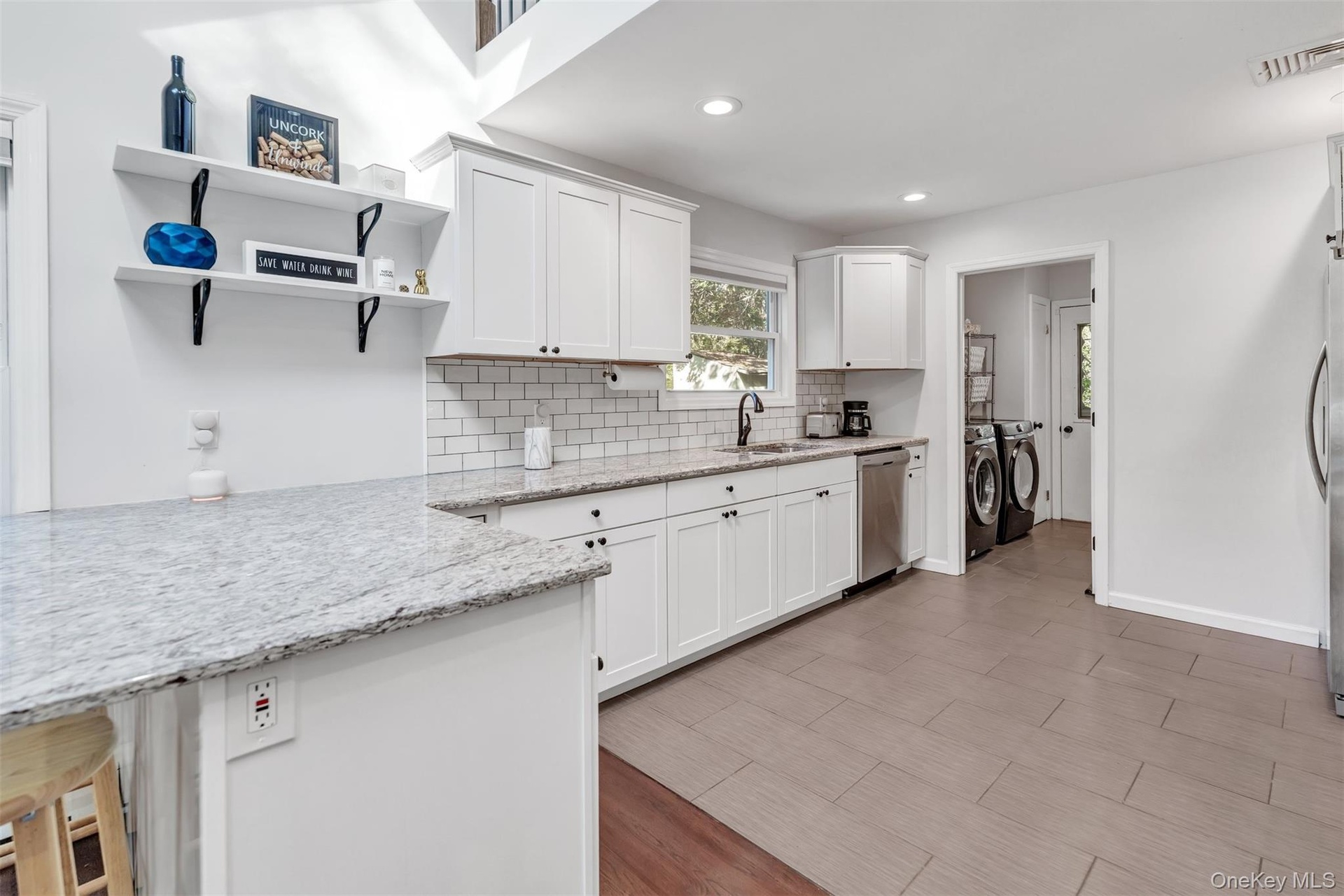 - Kitchen with decorative backsplash, appliances with stainless steel finishes, white cabinetry, light stone counters, and recessed lighting