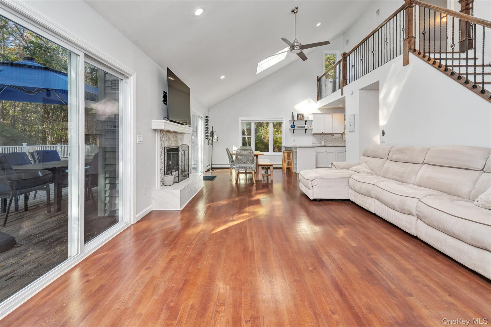 - Living area featuring high vaulted ceiling, recessed lighting, wood finished floors, a fireplace, and ceiling fan