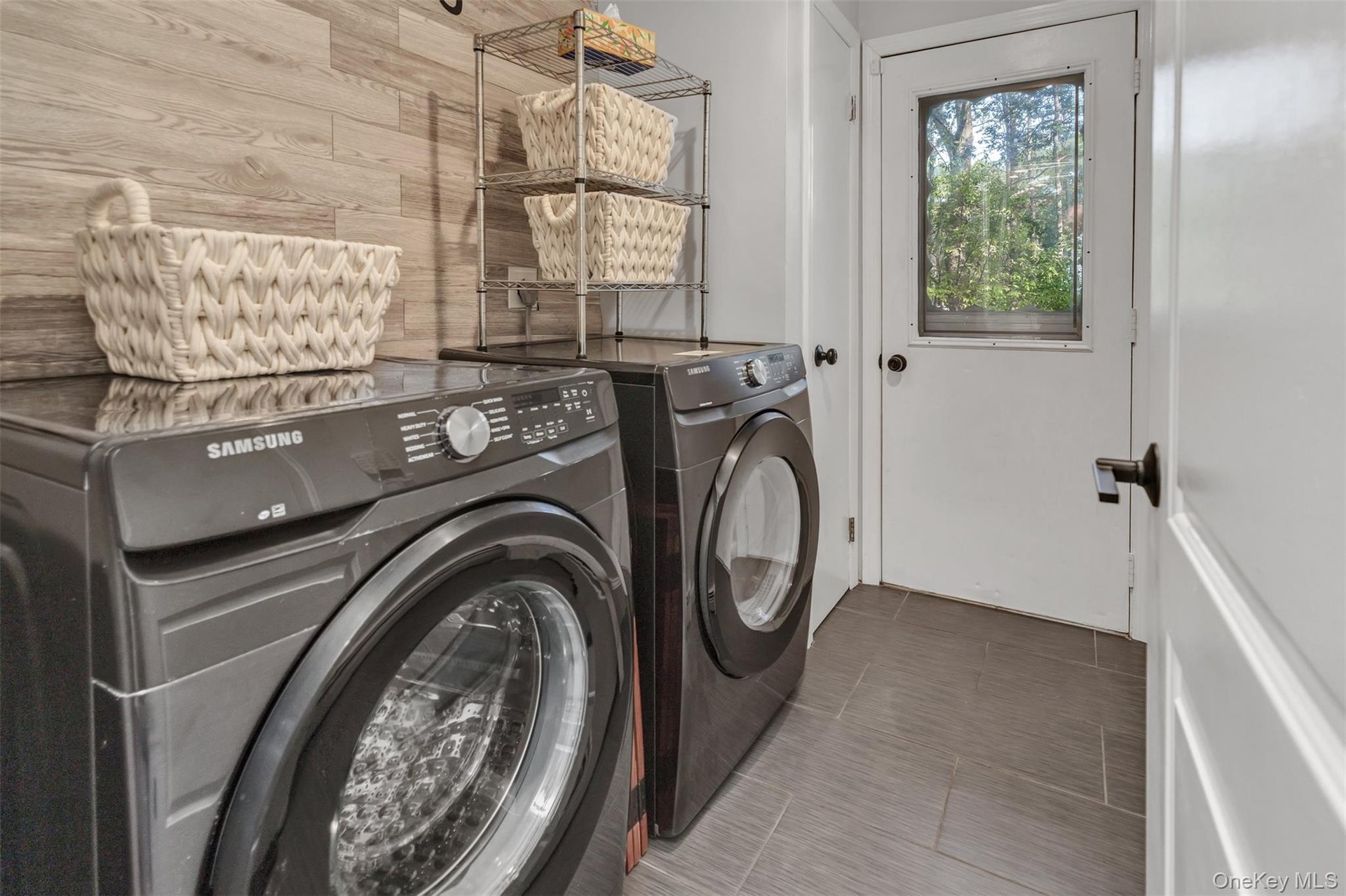 - Laundry room featuring tile patterned floors, washing machine and clothes dryer, and wood walls