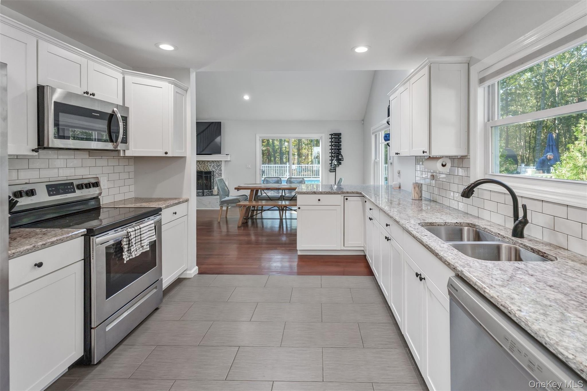 - Kitchen with tasteful backsplash, stainless steel appliances, light stone counters, white cabinetry, and recessed lighting
