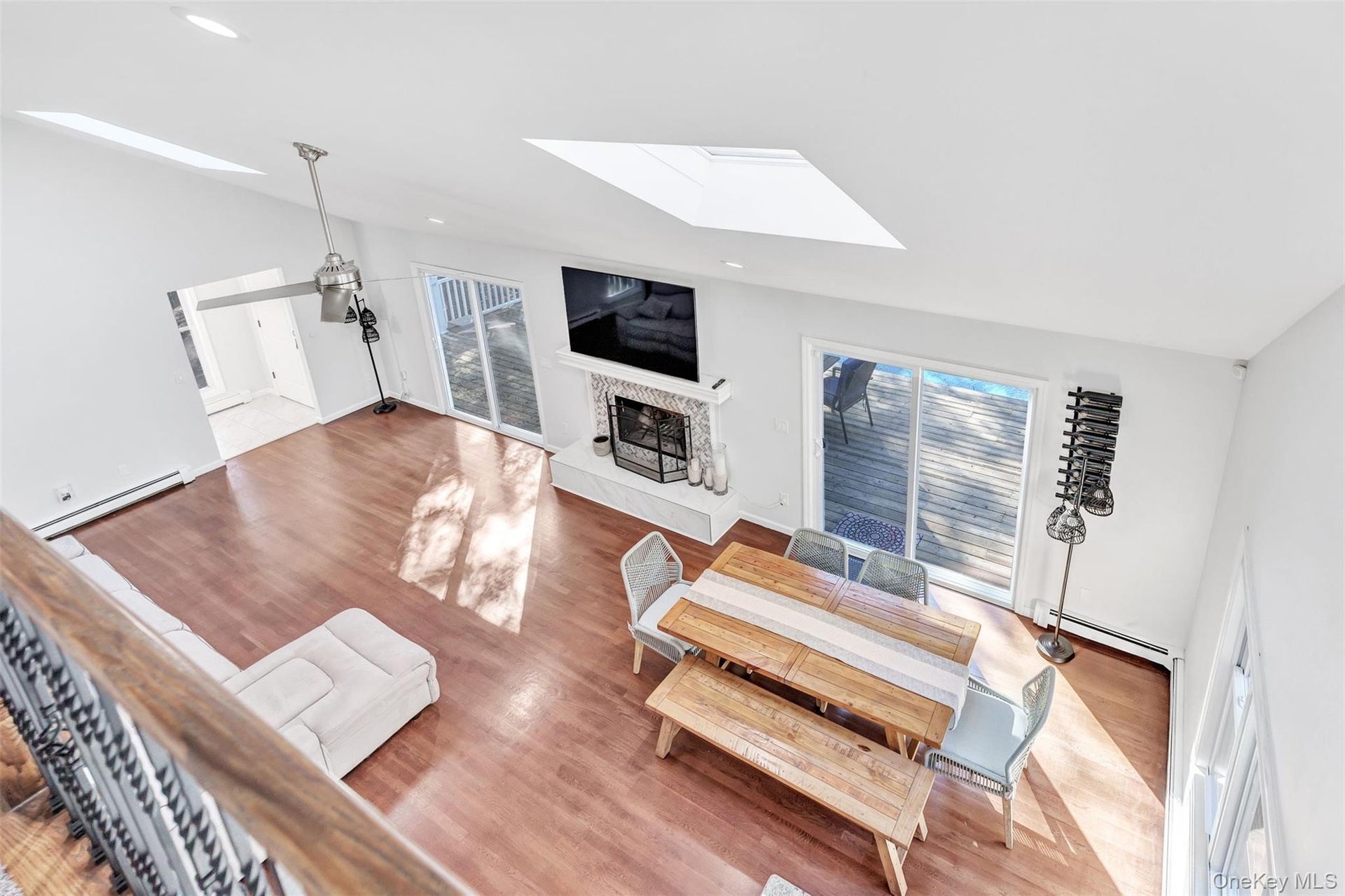- Dining area featuring a fireplace, high vaulted ceiling, wood finished floors, recessed lighting, and baseboard heating