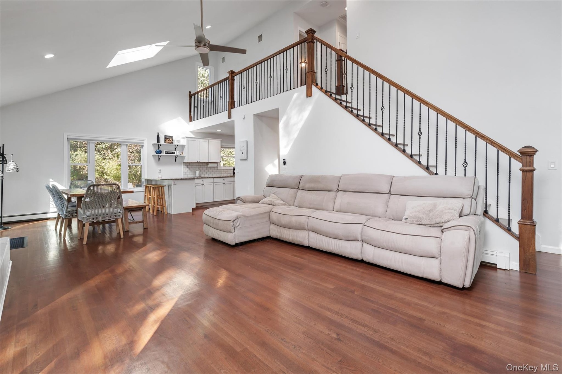 - Living room featuring high vaulted ceiling, stairway, dark wood finished floors, ceiling fan, and a skylight