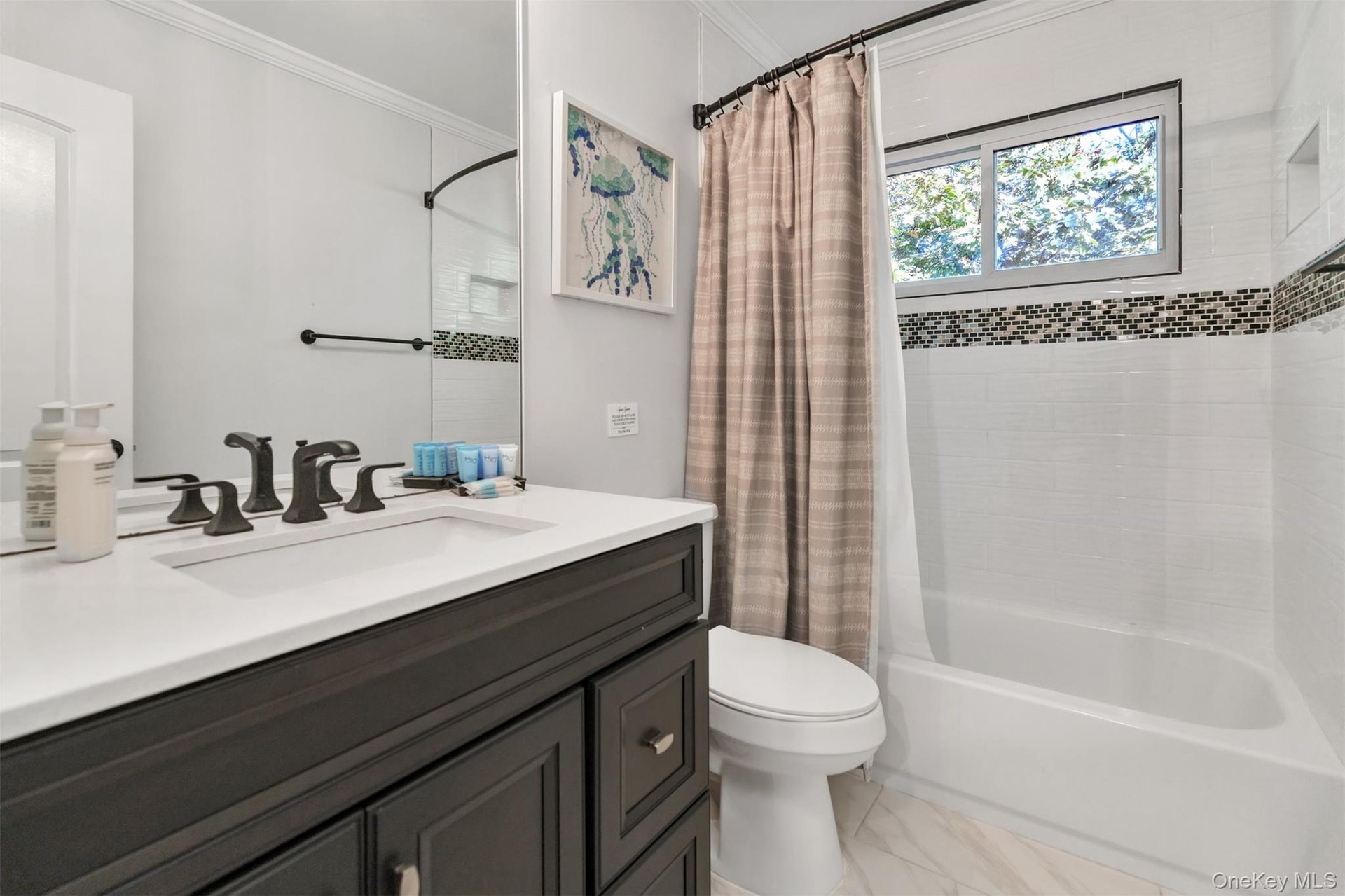- Upstairs Full bathroom featuring shower / tub combo, vanity, and crown molding