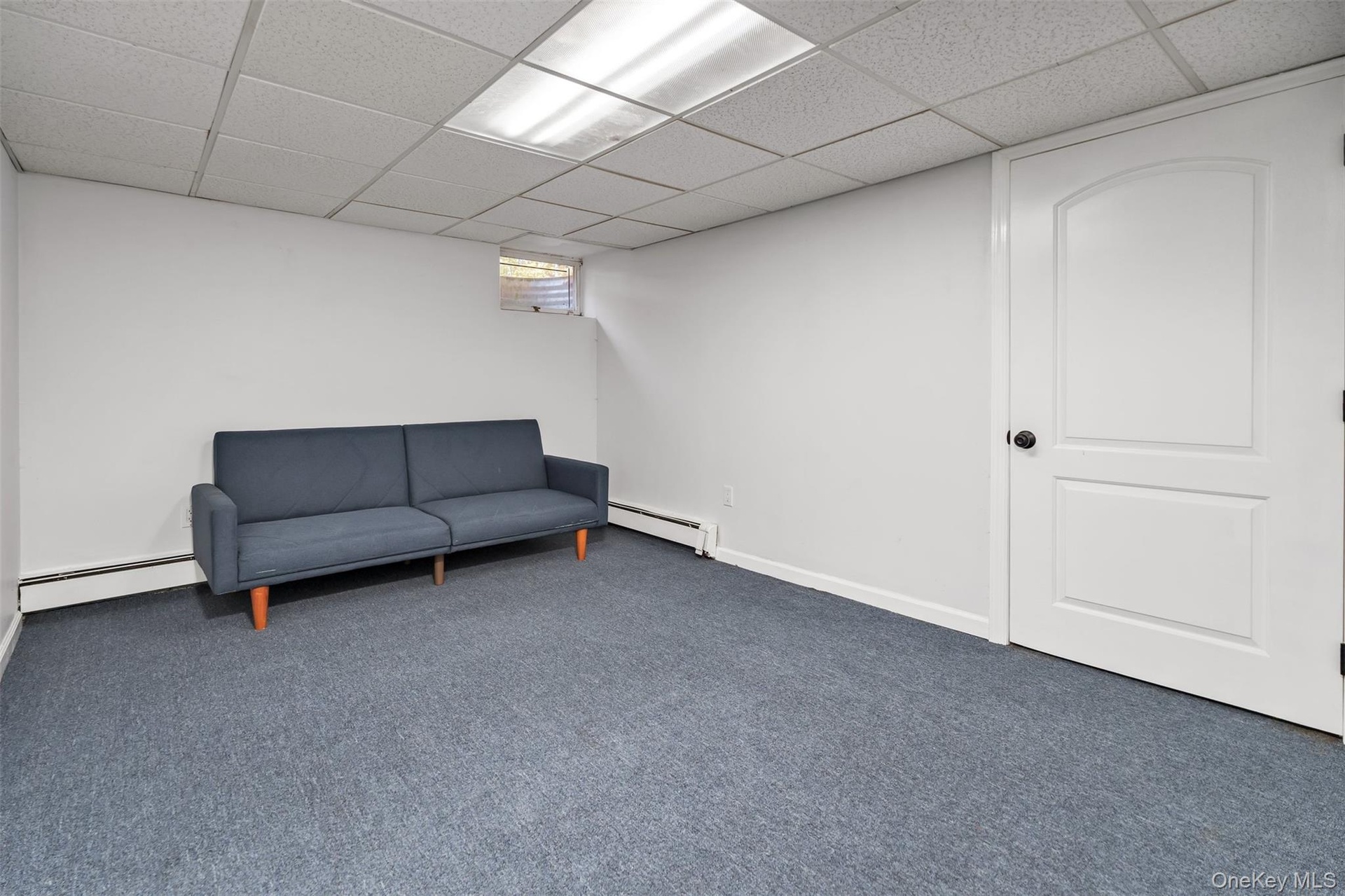 - Sitting room with a baseboard heating unit, carpet floors, and a drop ceiling