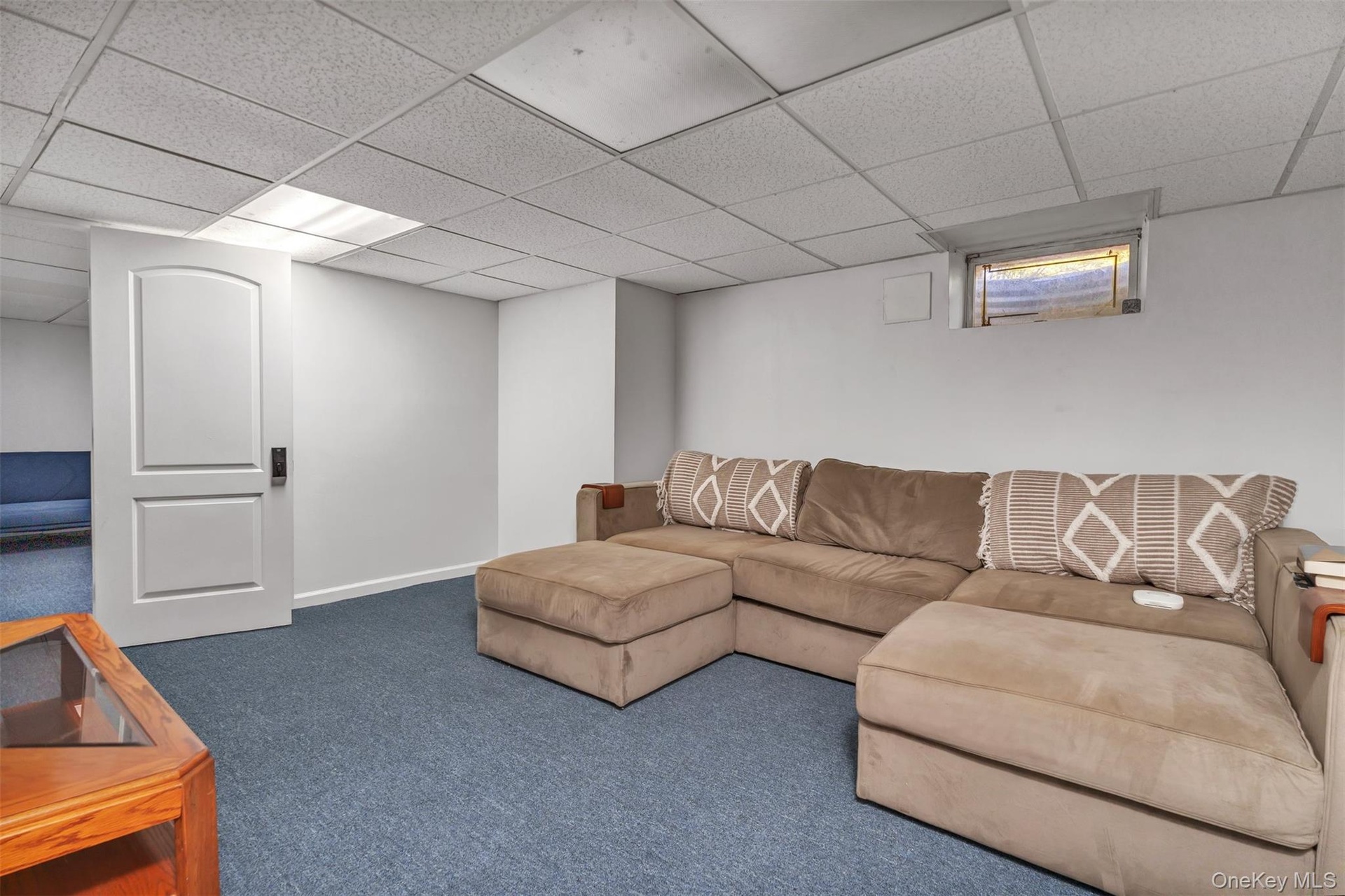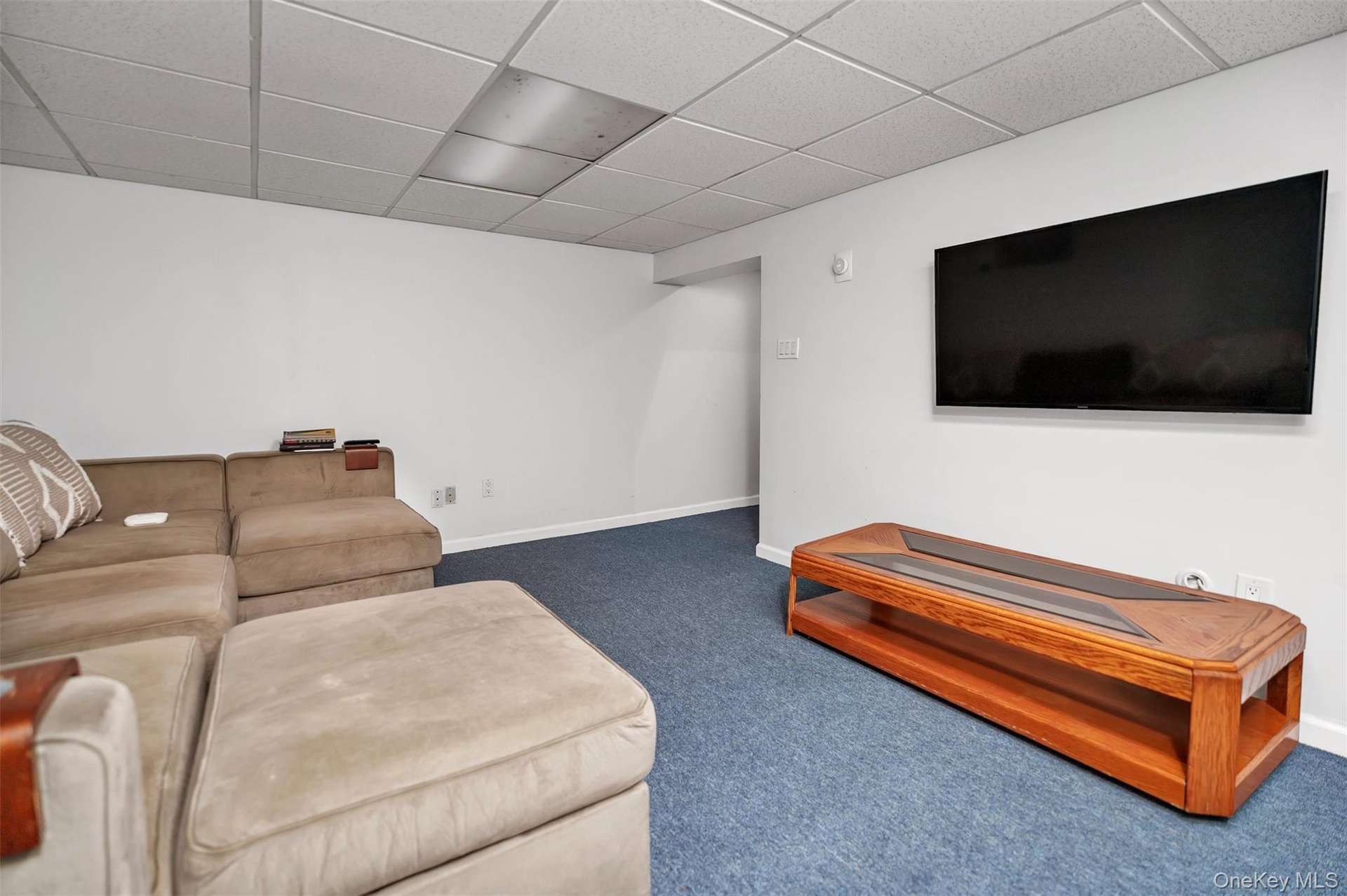 - Carpeted living room with a paneled ceiling
