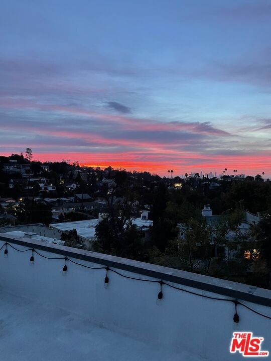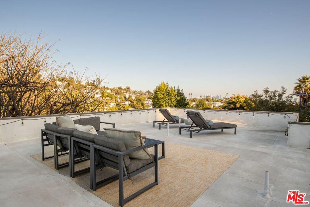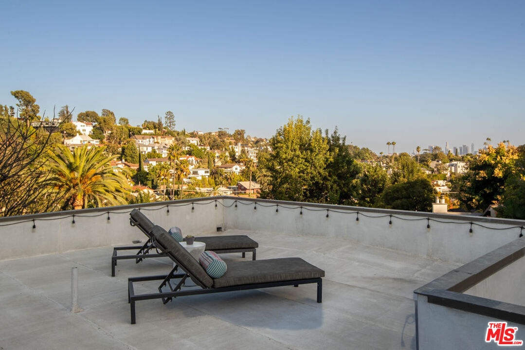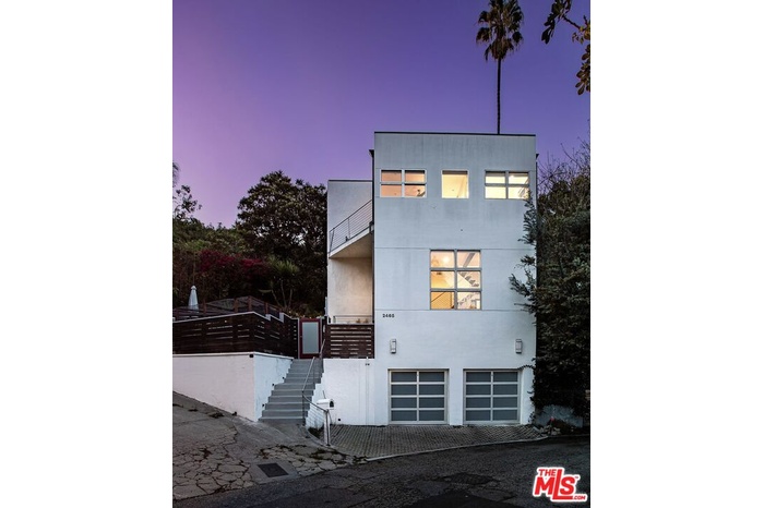 Discover a private canyon retreat that balances modern comfort with hillside character, just over half a mile up Beachwood Dr. Originally a 1925 cottage, this property was taken down to the studs and rebuilt into a light-filled modern 4-bedroom, 3-bath, 2-story home. Walls of picture windows surround the home, creating a treehouse-like atmosphere with natural light and 360 canyon views. Multiple outdoor spaces include a newly built 250 sq ft patio and a rooftop viewing deck showcasing stunning sunrises over downtown LA. Surrounding the patio, an enclosed organic vegetable garden and landscaped slope provide a lush green backdrop, creating a serene hideaway for outdoor dining and relaxation. Inside, soaring ceilings with exposed beams, wood floors, and a dramatic stacked-stone fireplace set the stage. The kitchen is equipped with Fisher & Paykel appliances including a dual refrigerator/freezer. A versatile bedroom with an adjoining bathroom, ideal for guests or a home office completes the main level. Upstairs, the primary suite and two additional bedrooms each have access to their own private balconies. The rare 2-car garage makes hillside living effortless. Whether entertaining, working from home, or unwinding above the city, this Beachwood Canyon residence offers the best of Hollywood Hills living.