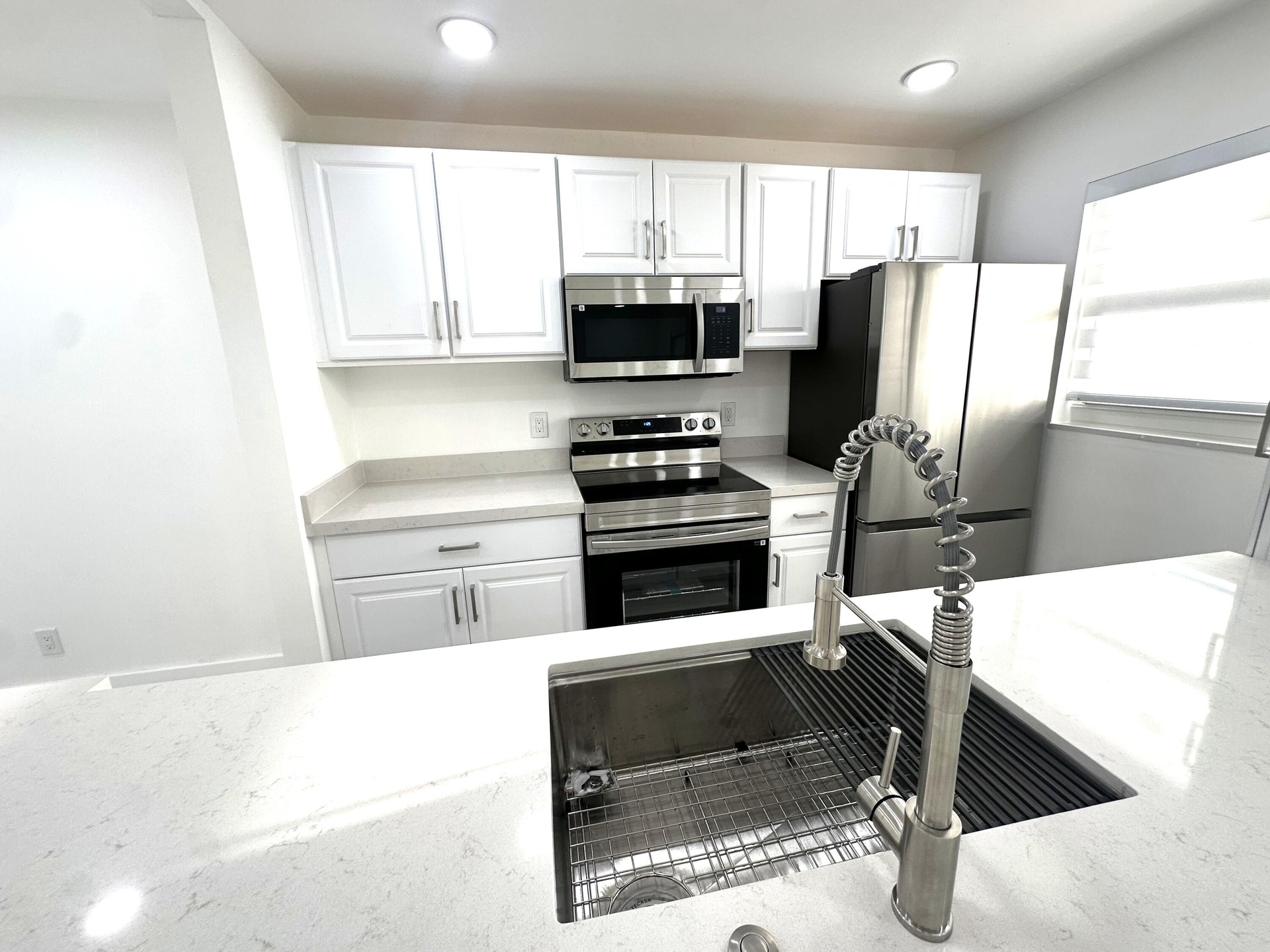 Open and bright, this fully updated 2-bedroom, 2-bath villa/condo offers modern living at its finest. Featuring full impact glass, new flooring throughout, and custom window treatments, every detail has been carefully designed. The state-of-the-art kitchen boasts a stunning waterfall island, premium appliances including a washer/dryer combo, and sleek finishes. Both bathrooms have been beautifully renovated, complementing the home's contemporary style. Additional upgrades include an updated electrical panel, acoustic wood wall paneling designed for a flat-screen TV, and color-changing recessed lighting throughout to set the perfect mood. Ideally located just minutes from vibrant downtown Delray Beach and Atlantic Avenue.