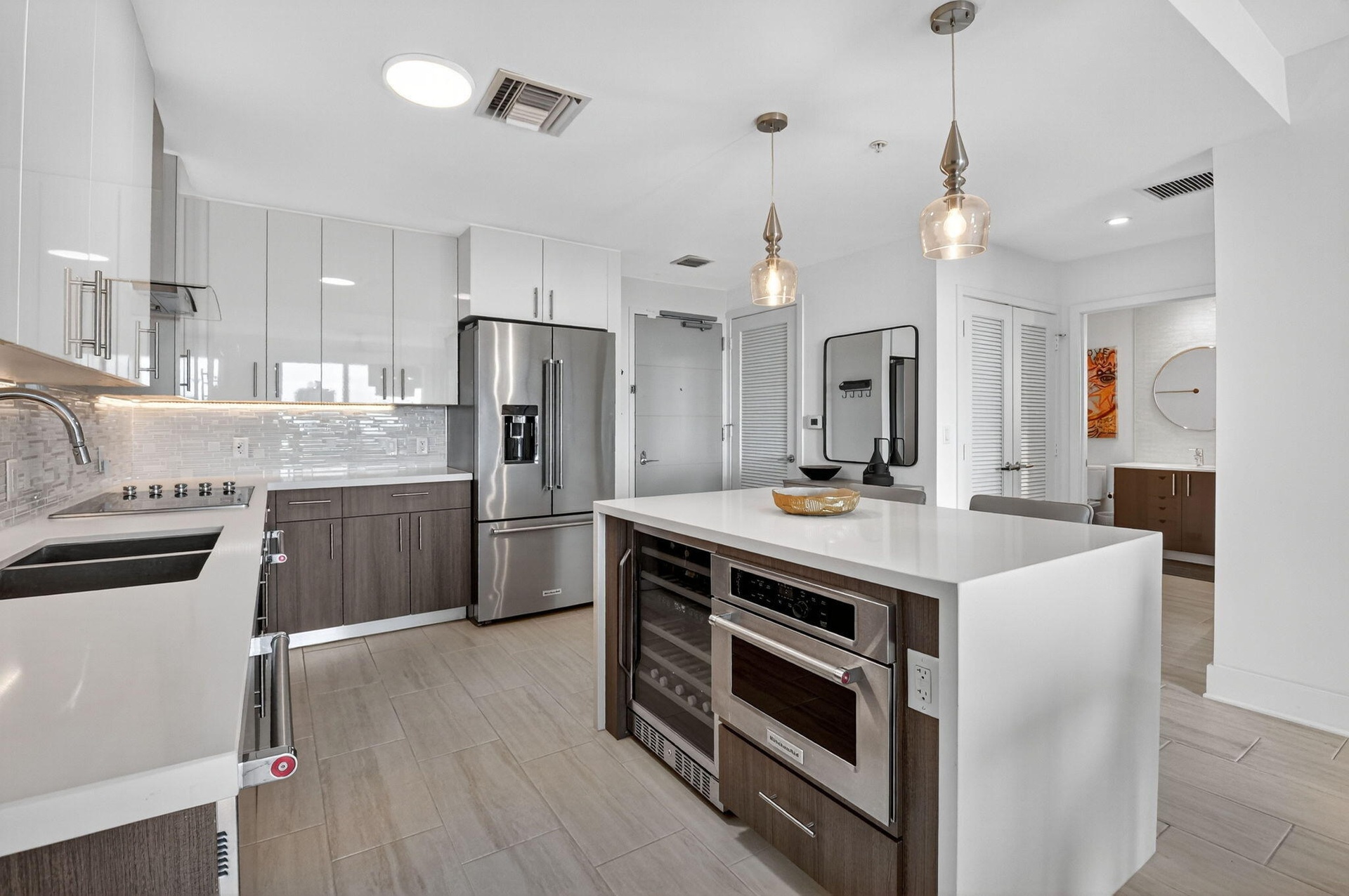 Live the downtown Delray lifestyle in this penthouse-level 1-bedroom condo at 236 Fifth, one of the area's most sought-after newer buildings. Enjoy ocean glimpses from your oversized private balcony and designer finishes throughout. The open-concept kitchen features a quartz waterfall island, two-tone cabinetry, mosaic backsplash, KitchenAid appliances, and a wine fridge. You'll have access to the Aloft hotel amenities including the resort-style pool, fitness center, restaurant, and bar, along with a private residents-only club room with wine lockers. Covered garage parking and private storage locker are included. With smart-key building access, concierge, and a prime location just two blocks from Atlantic Avenue and 1.1 miles from the beach, this is luxury living at its best.