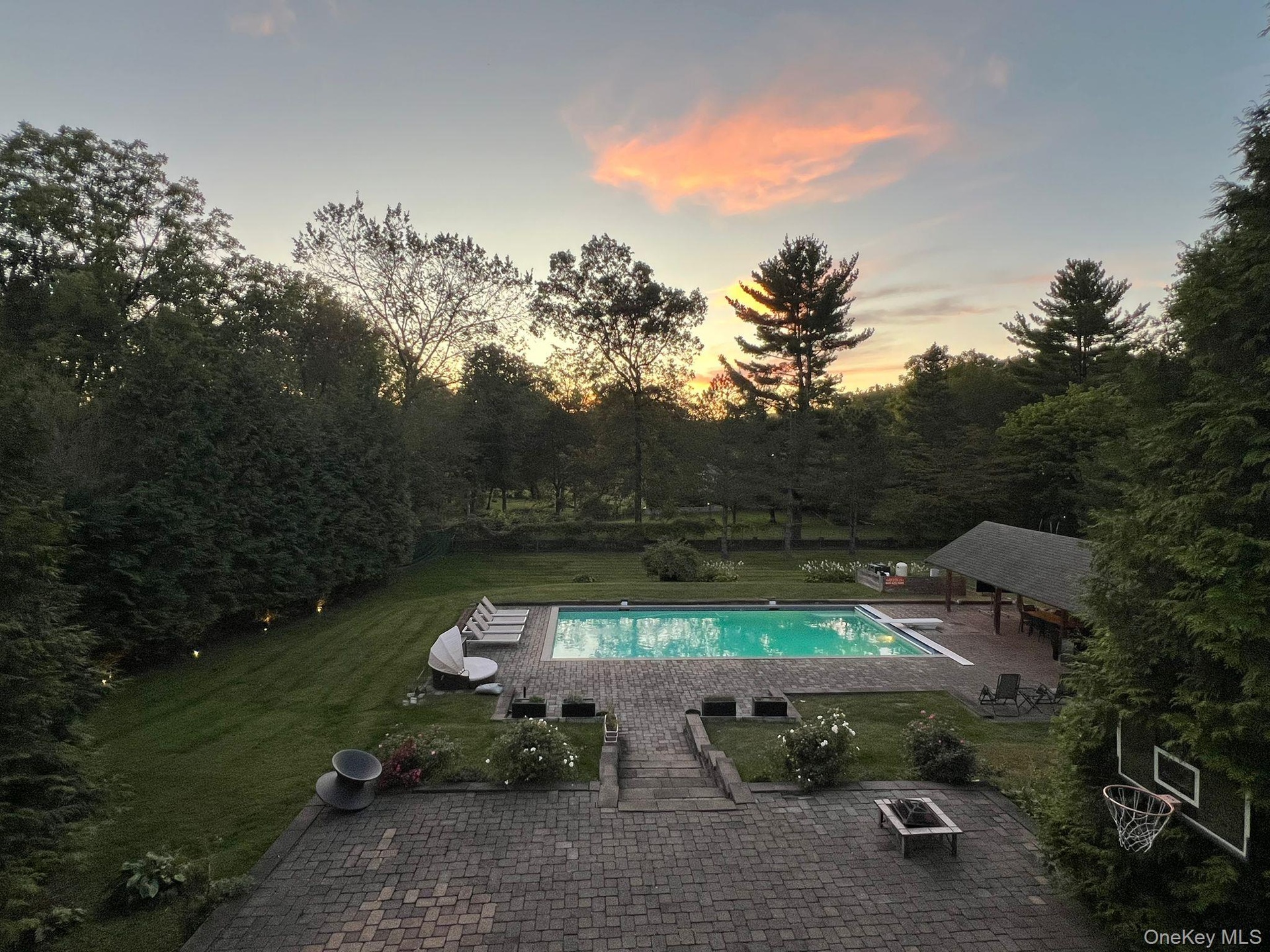 - Pool at dusk with an outdoor pool, a patio, an outdoor fire pit, and a lawn