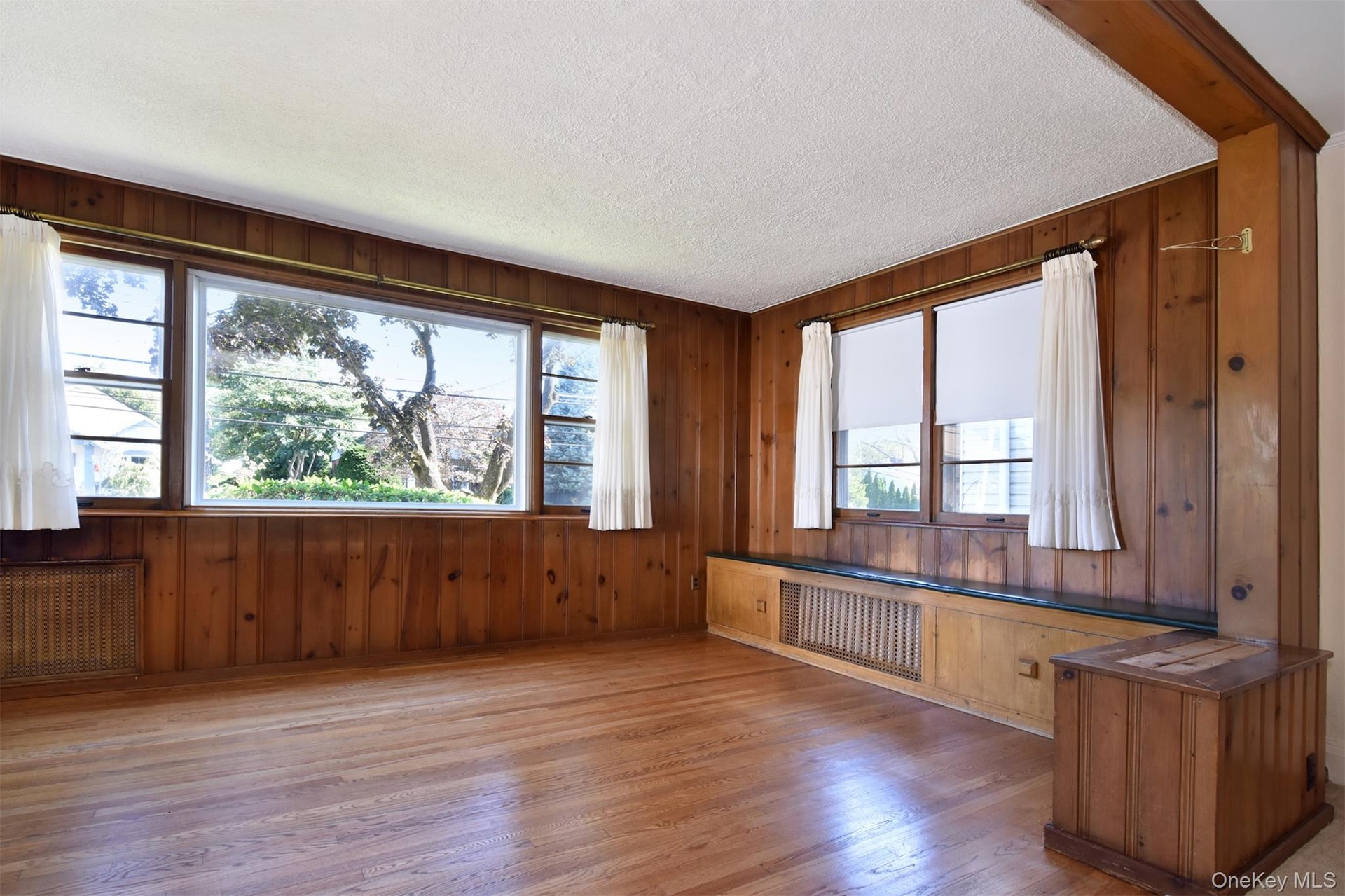 - Unfurnished room featuring wood walls, radiator heating unit, light wood-type flooring, and a textured ceiling