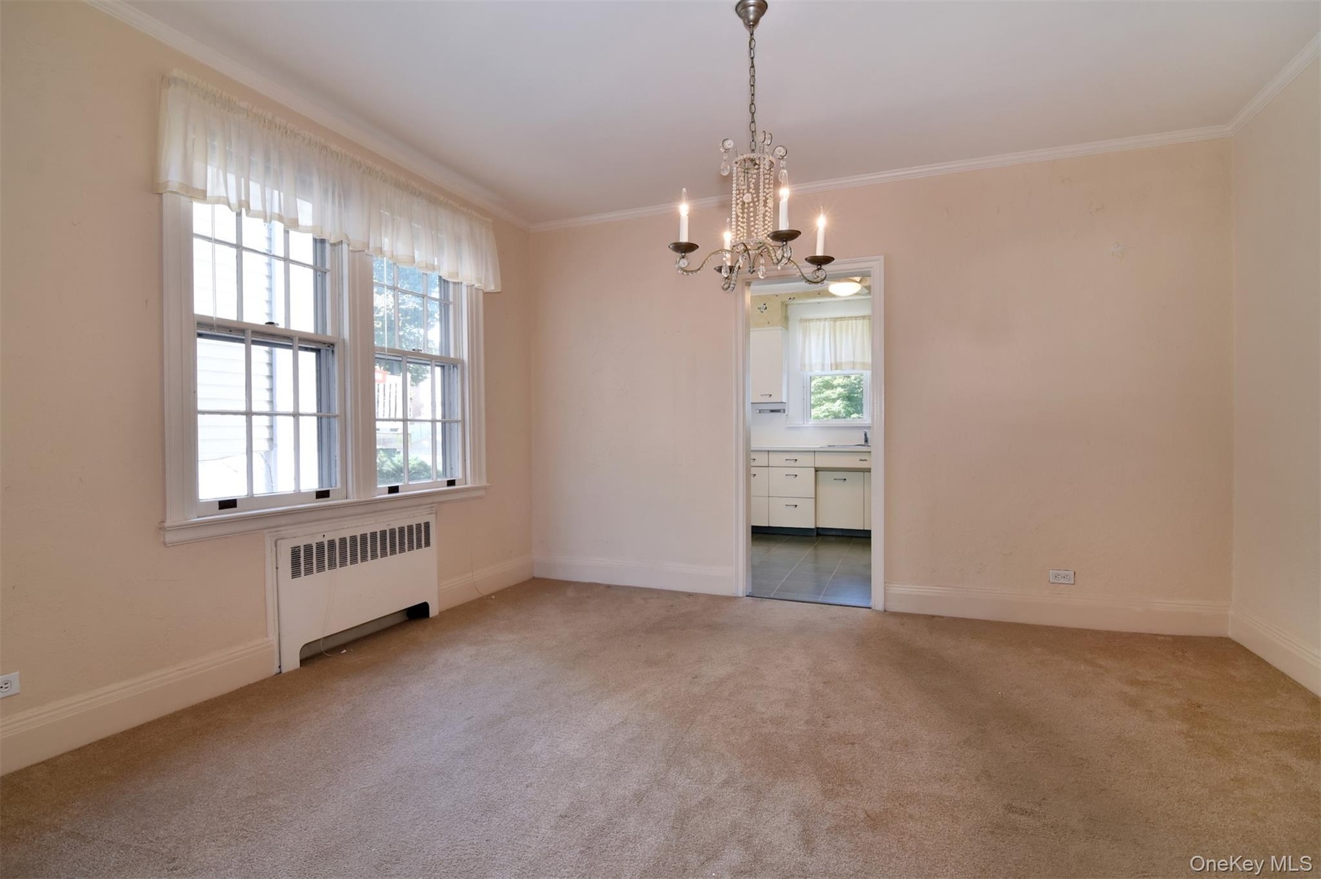 - Unfurnished living room with arched walkways, radiator heating unit, light colored carpet, ornamental molding, and a stone fireplace