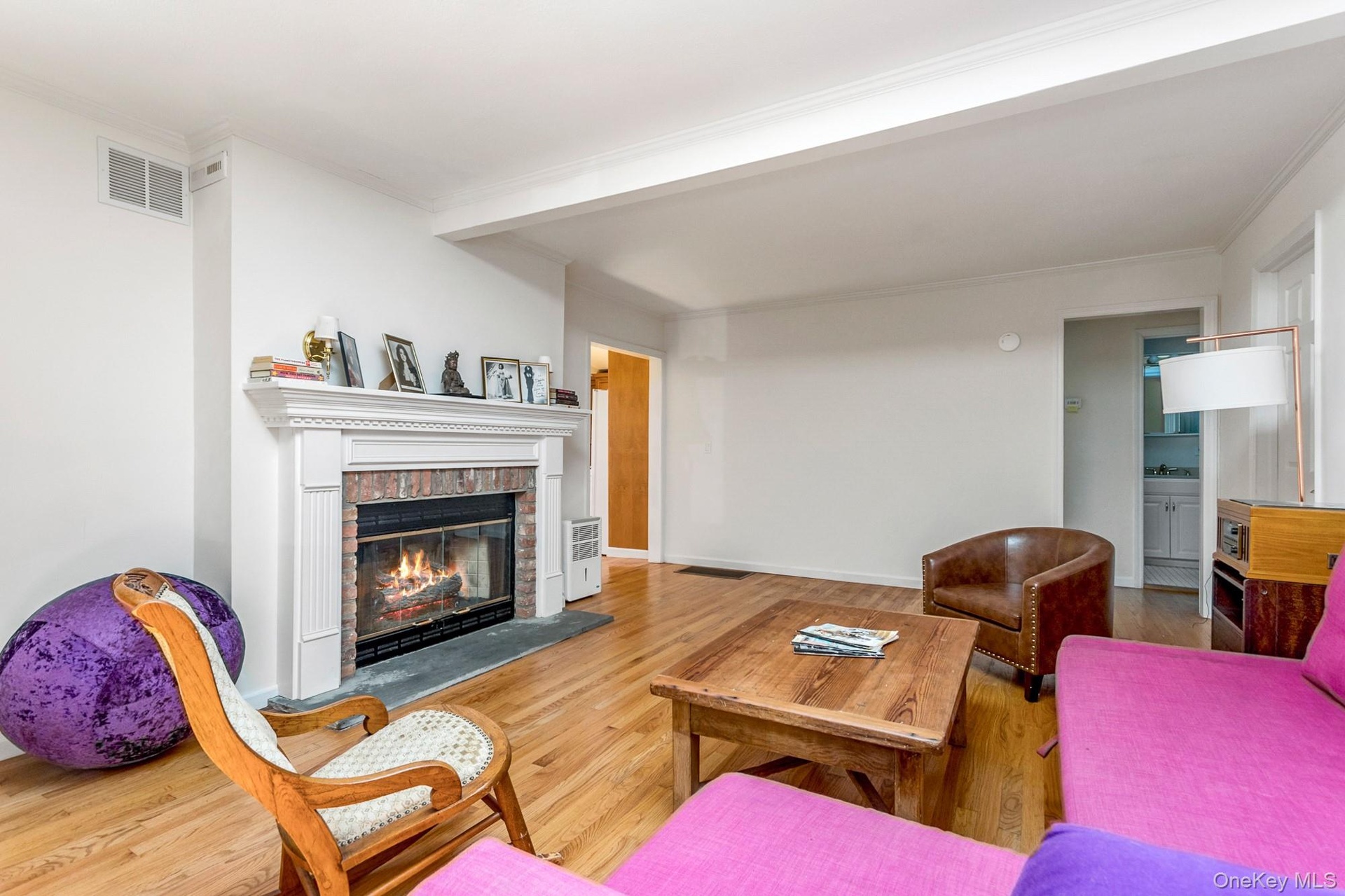 - Living room featuring a fireplace, crown molding, and wood finished floors
