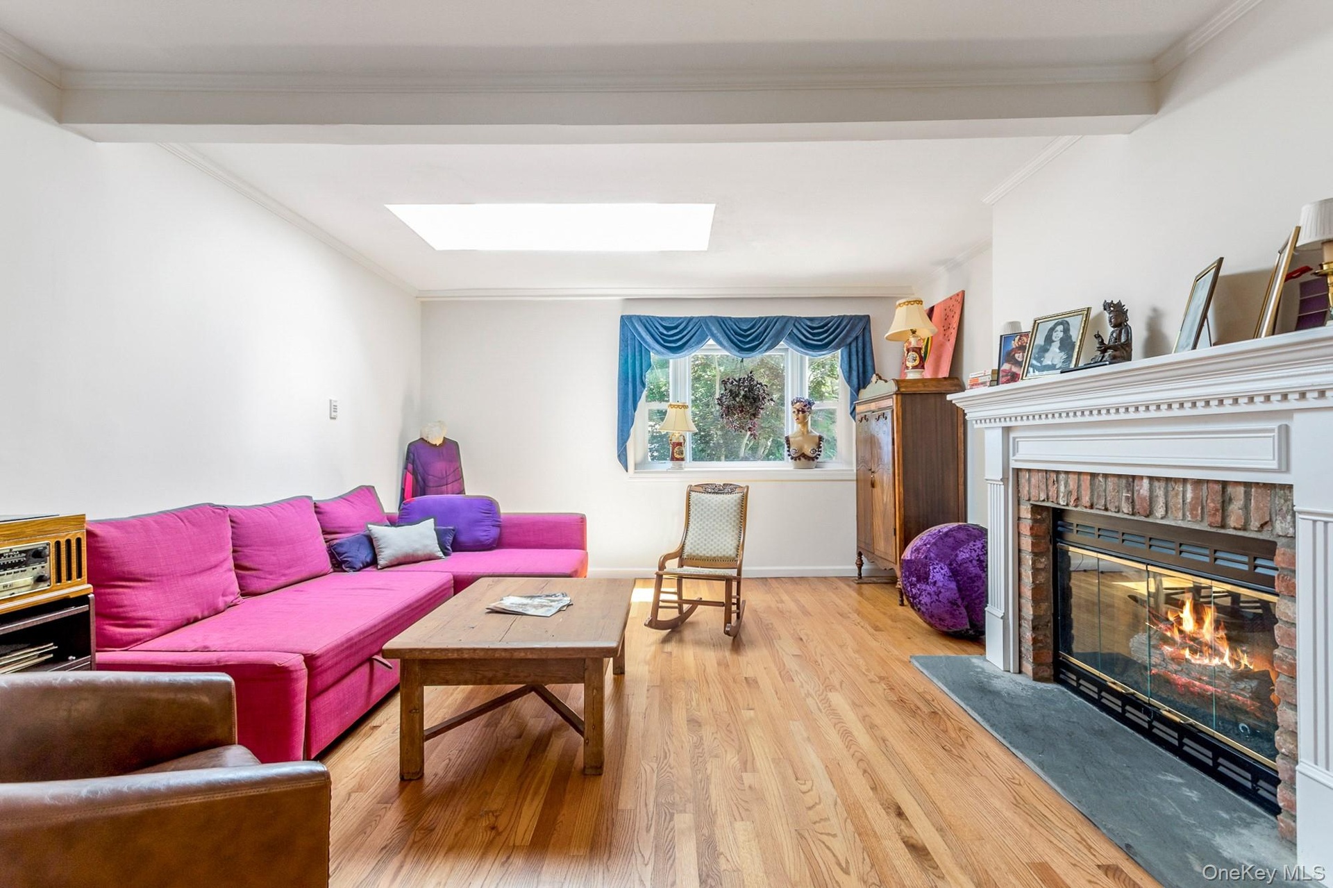 - Living area featuring ornamental molding, light wood-type flooring, a brick fireplace, and a skylight