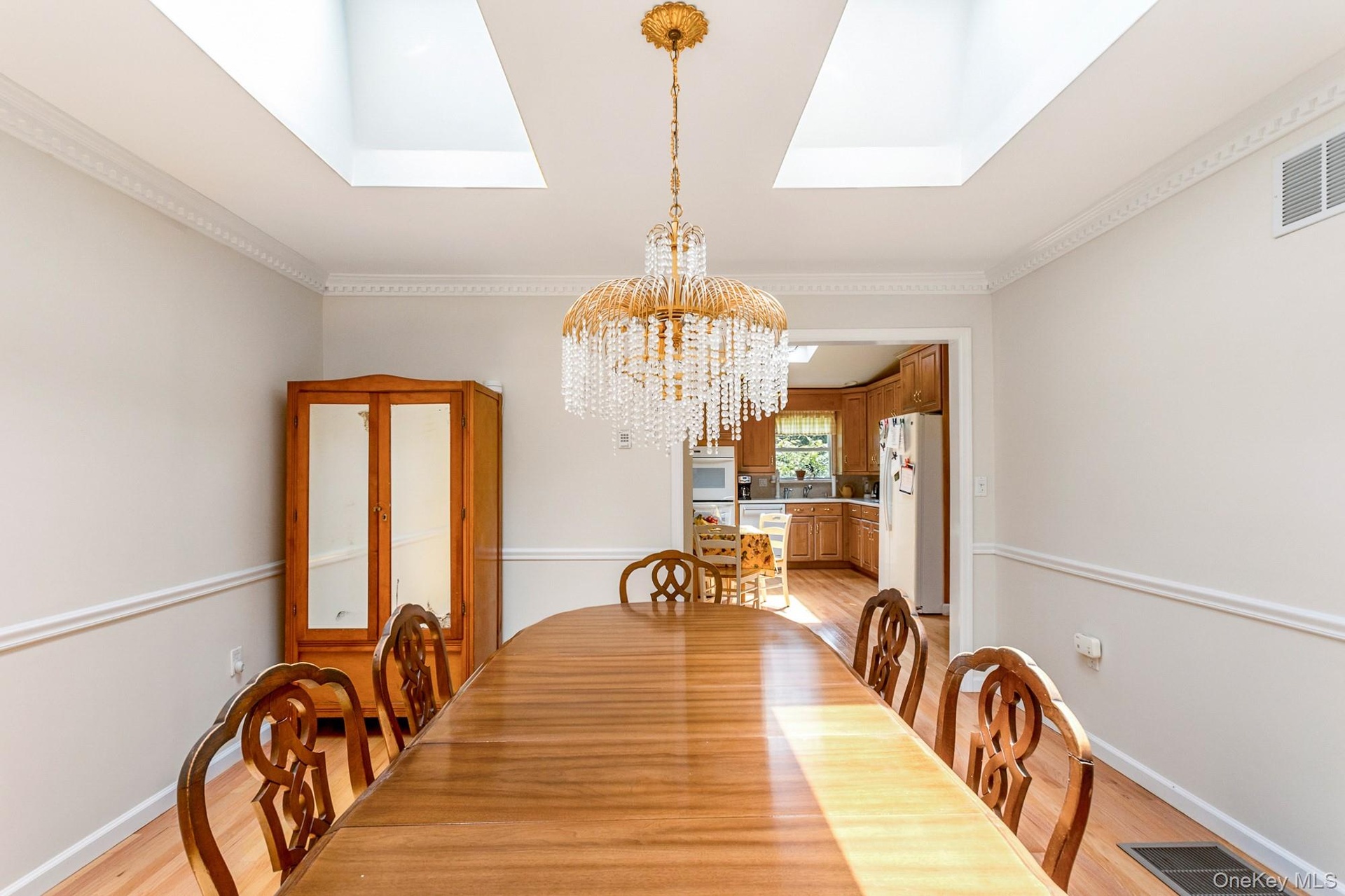- Dining space featuring a skylight, a chandelier, and light wood-type flooring