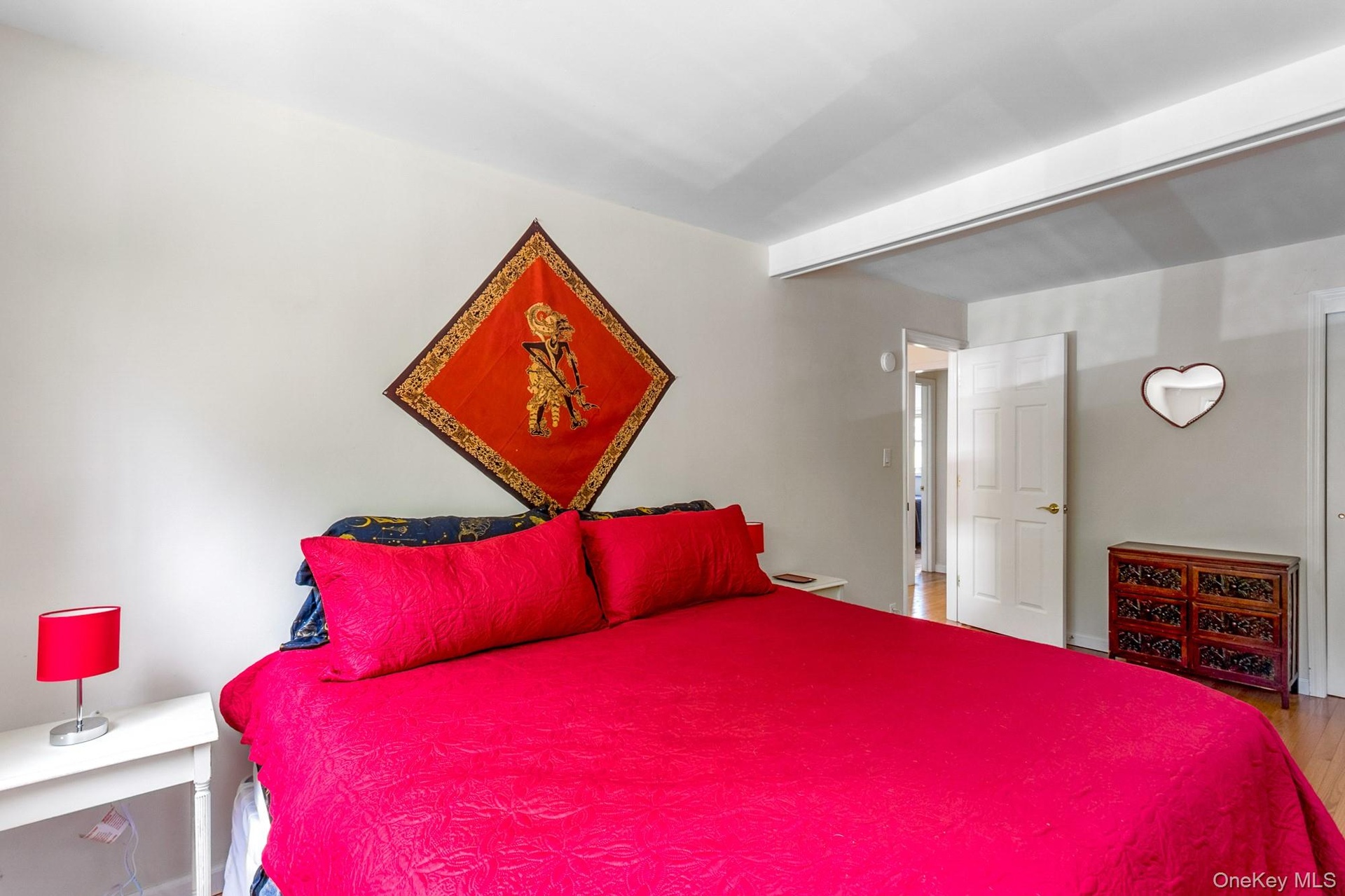- Bedroom featuring wood finished floors, a brick fireplace, and beamed ceiling