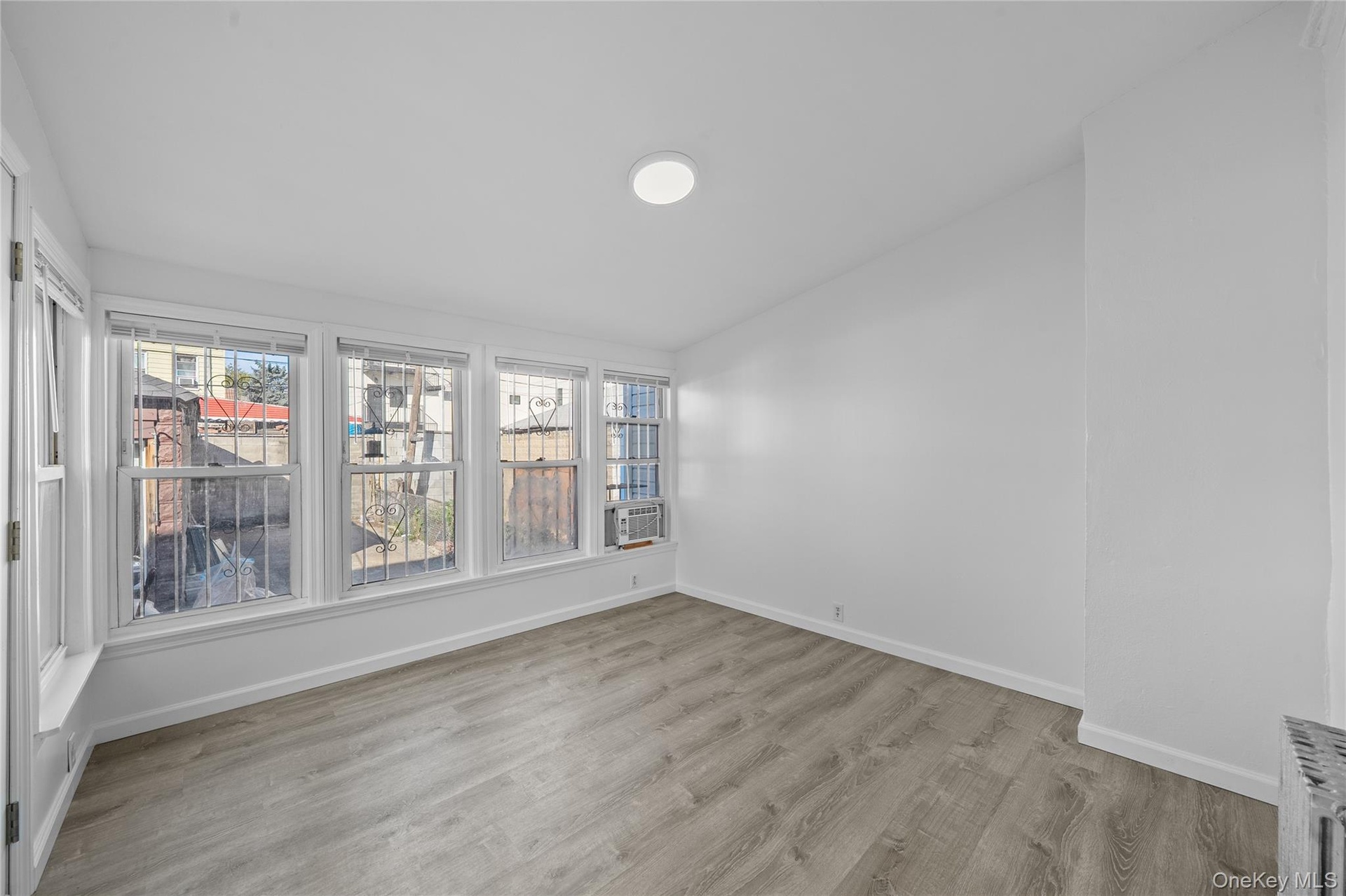 - Unfurnished room with a baseboard heating unit, wood finished floors, and cooling unit