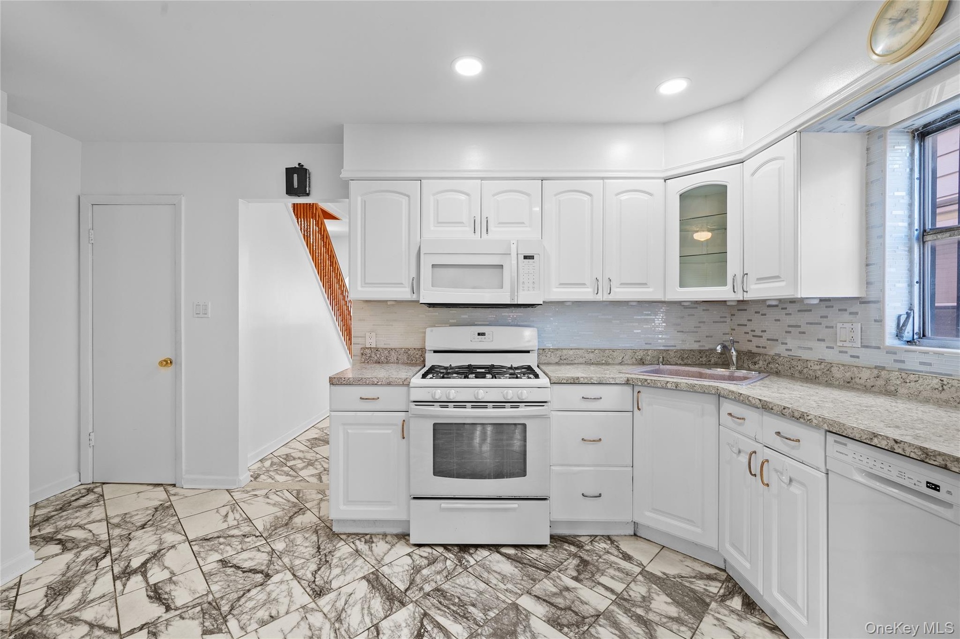 - Kitchen featuring white appliances, light marble finish floors, white cabinets, decorative backsplash, and light countertops