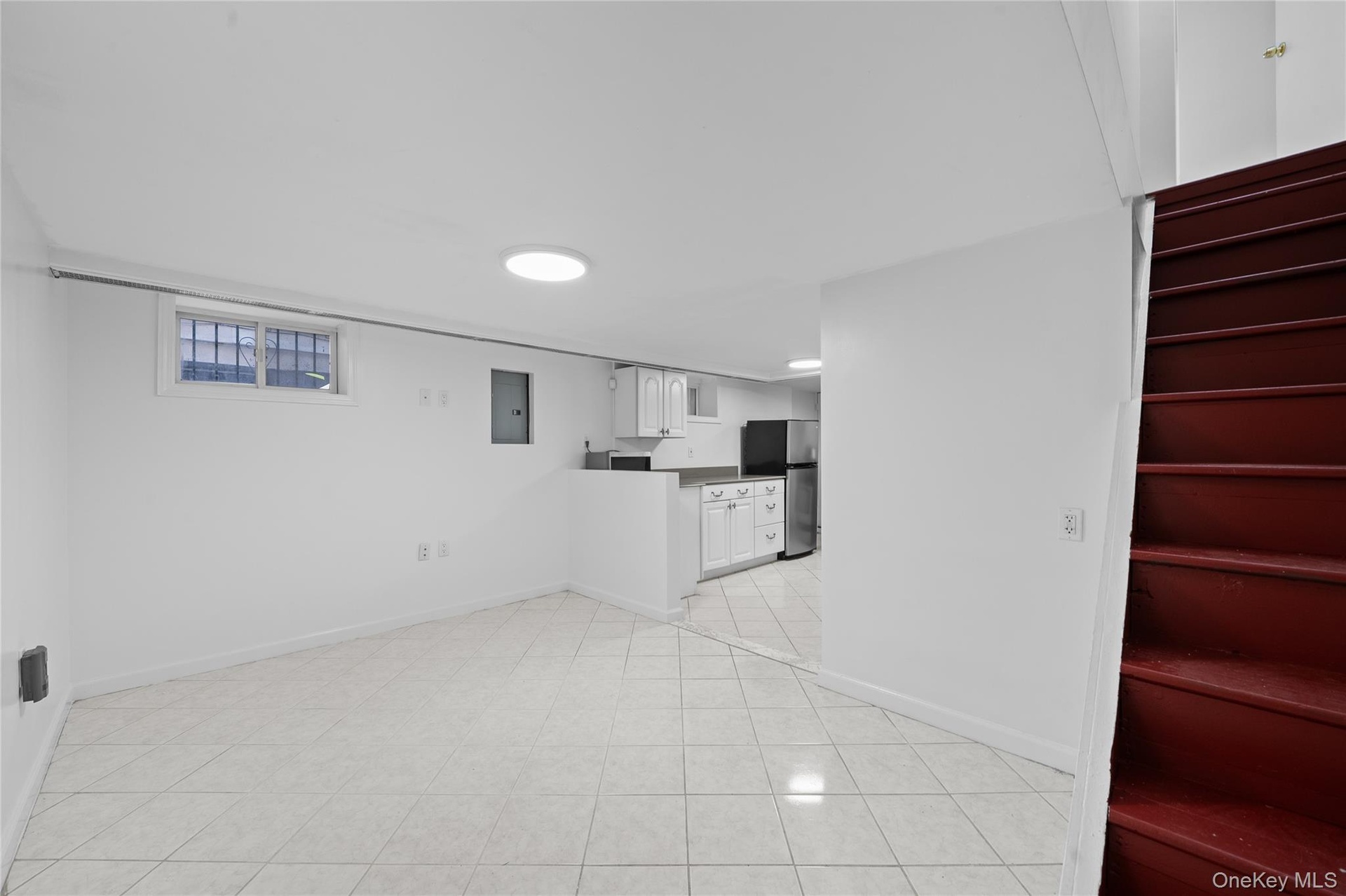 - Basement with freestanding refrigerator, electric panel, and light tile patterned floors