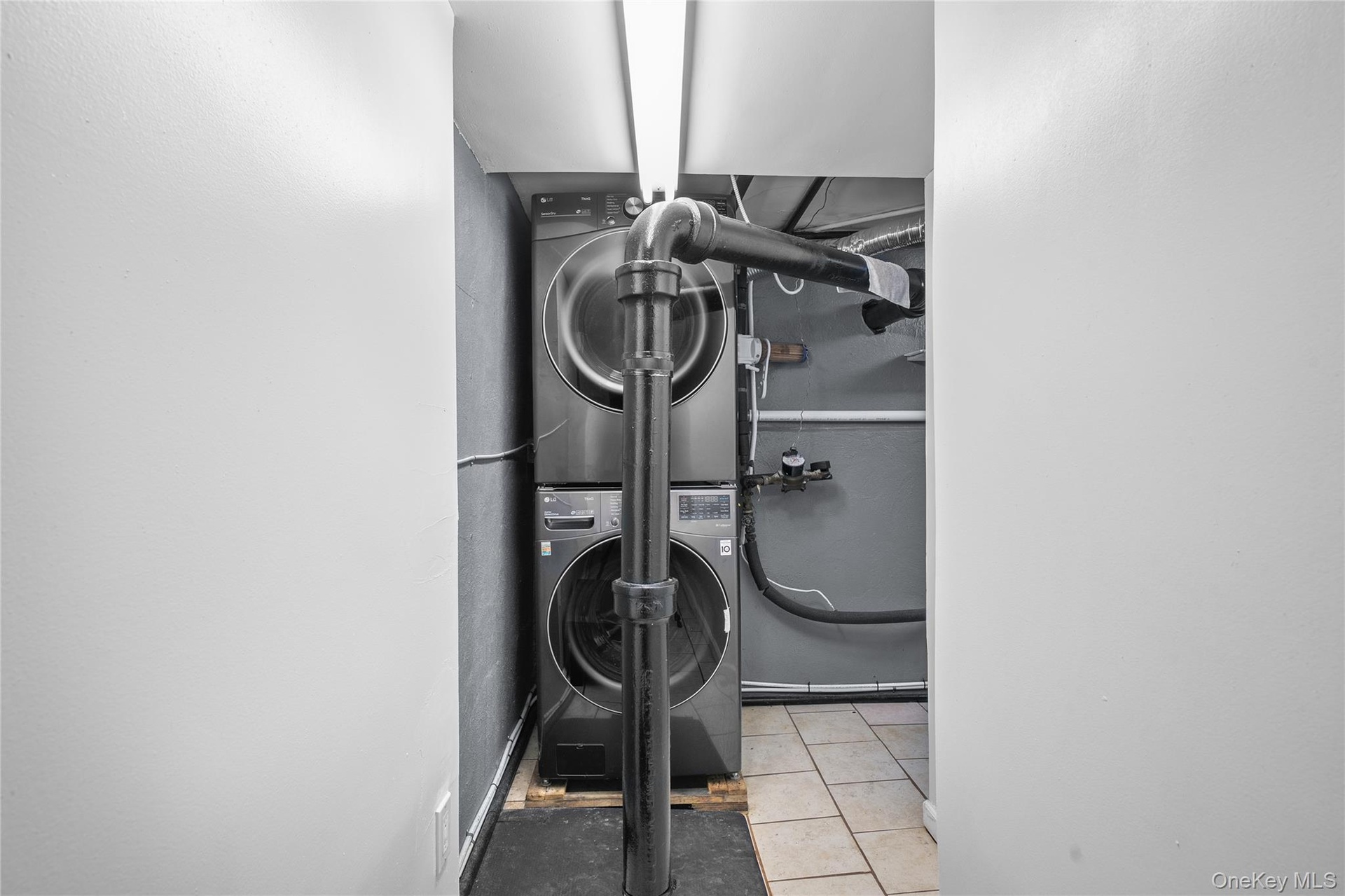 - Washroom featuring light tile patterned floors and stacked washing machine and dryer