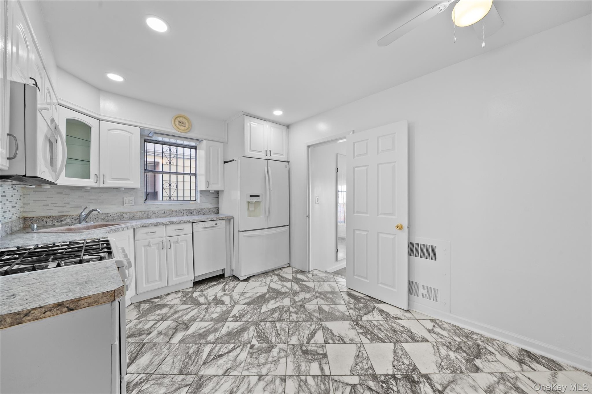 - Kitchen featuring white appliances, light countertops, tasteful backsplash, white cabinetry, and recessed lighting