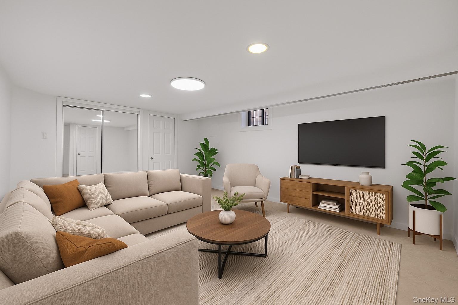 - Living area featuring light marble finish floors and baseboard heating. Virtually Staged.