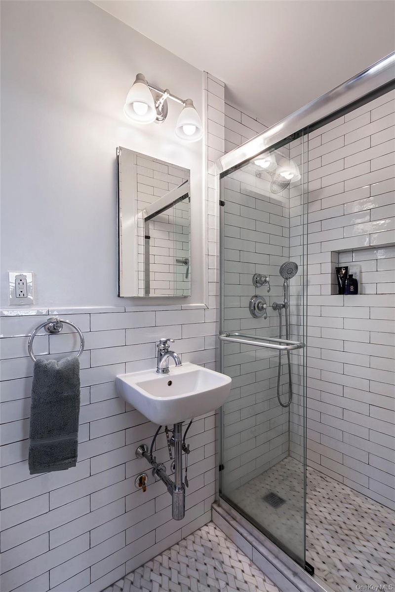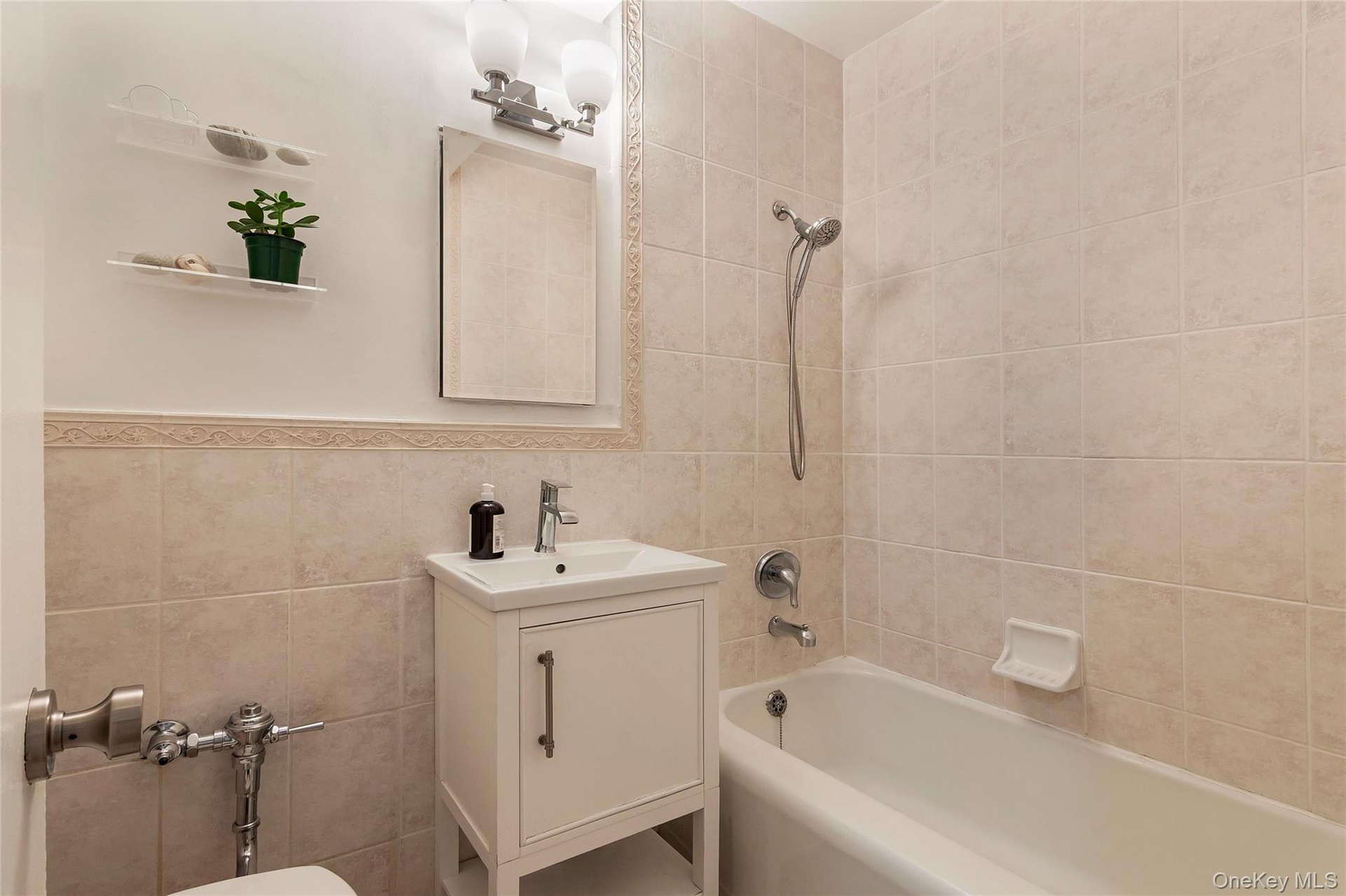 - Bathroom with tile walls, shower / washtub combination, and vanity