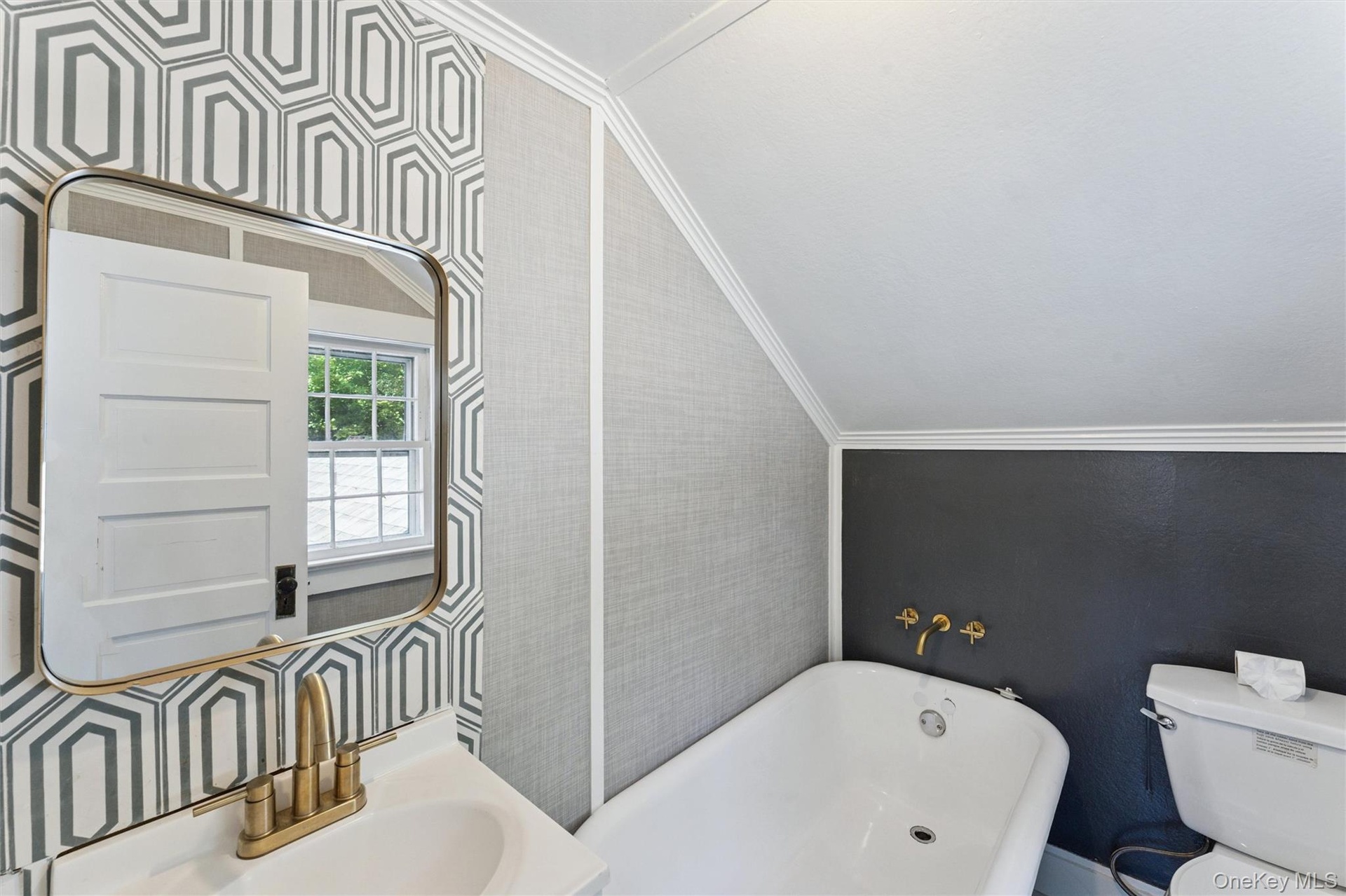 - Full bathroom with a soaking tub, wallpapered walls, crown molding, and vaulted ceiling