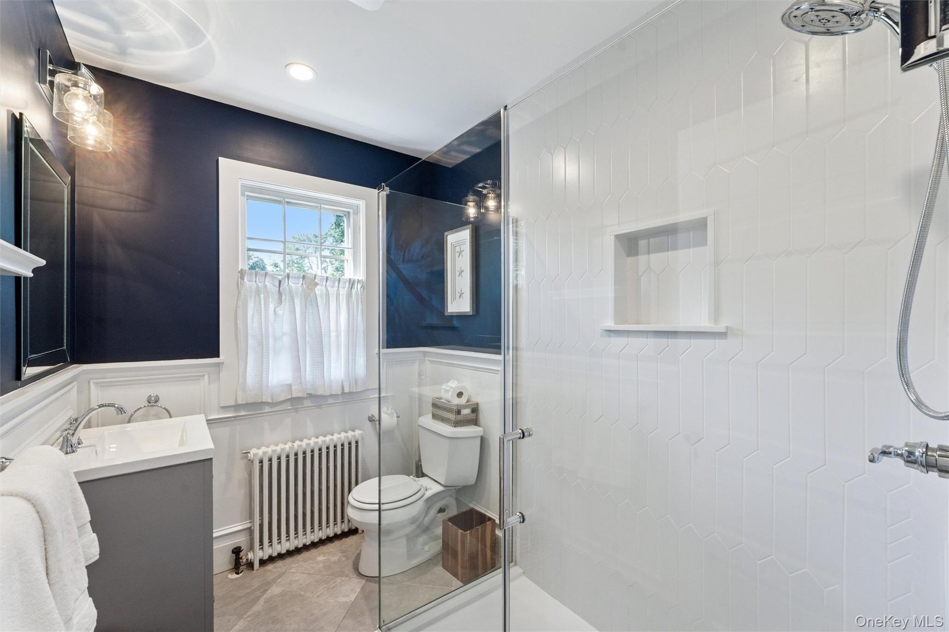 - Bathroom featuring a shower stall, vanity, radiator heating unit, a wainscoted wall, and recessed lighting