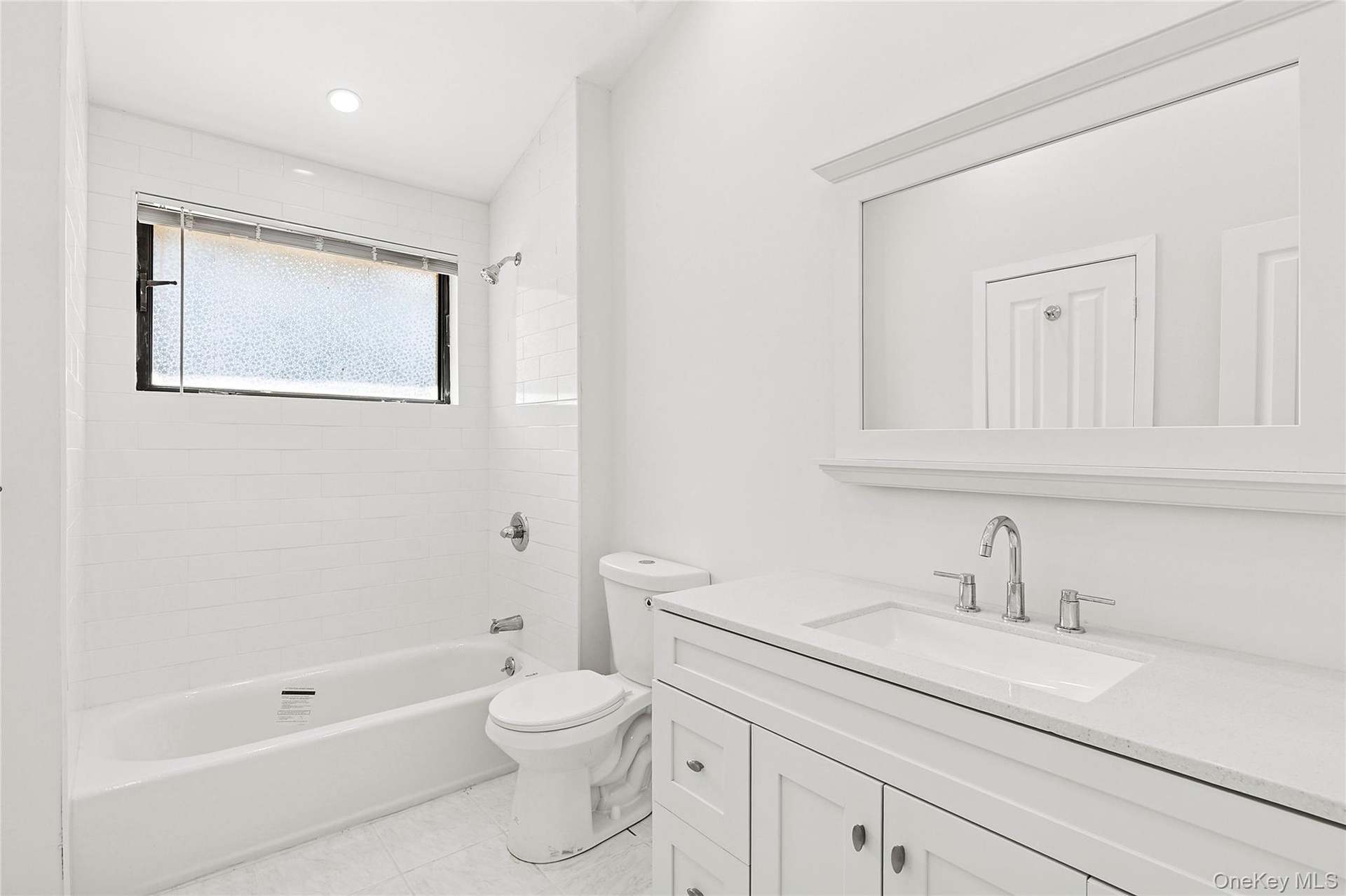 - Full bathroom featuring tub / shower combination, vanity, light tile patterned flooring, and recessed lighting