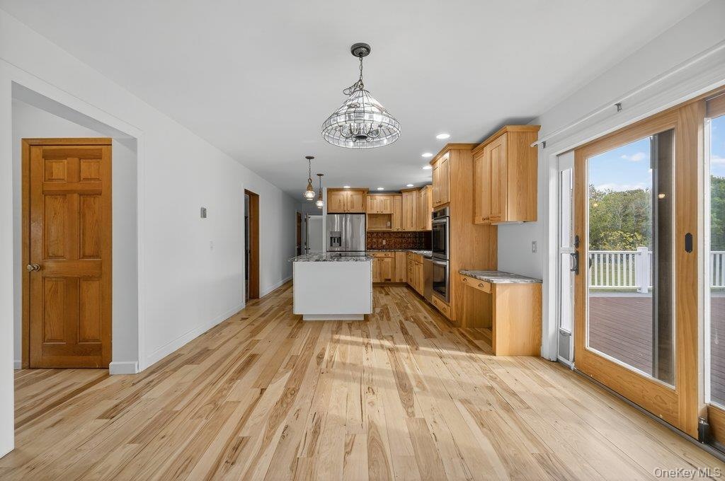 - Kitchen featuring appliances with stainless steel finishes, light wood-style floors, backsplash, dark stone countertops, and hanging light fixtures