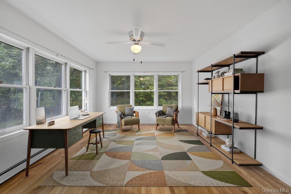 - Office area with baseboard heating, light wood-style floors, and ceiling fan