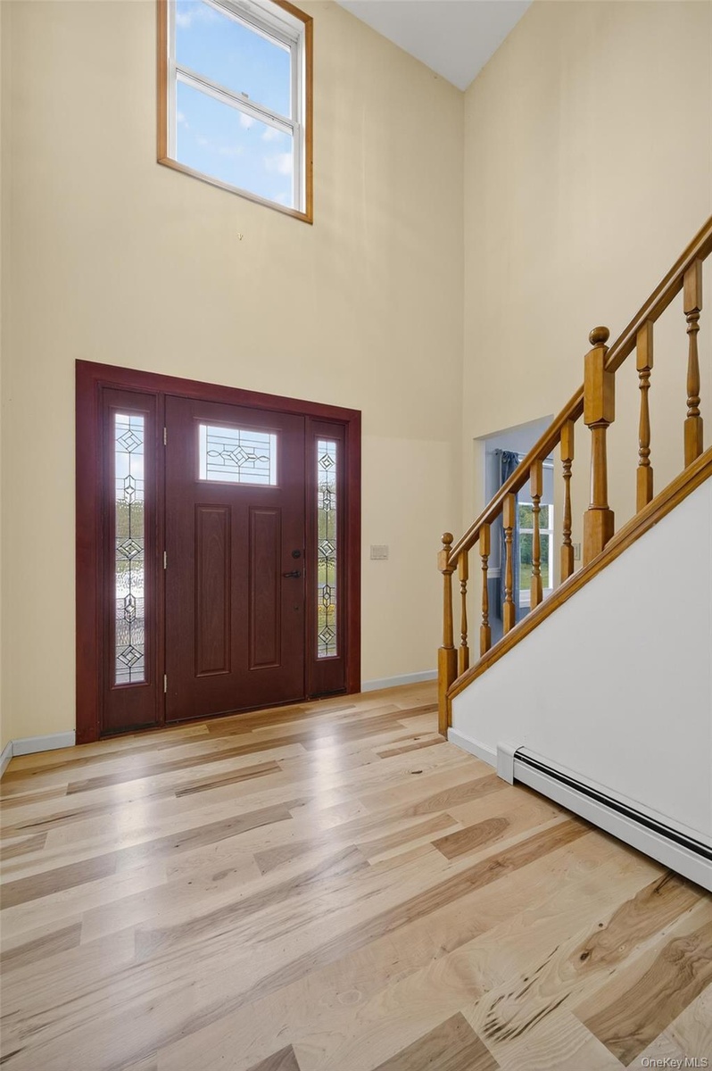 - Foyer entrance with stairs, light wood finished floors, baseboard heating, and a high ceiling