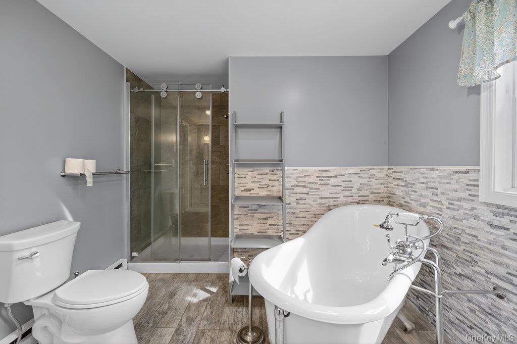 - Bathroom featuring a freestanding bath, wood finished floors, a stall shower, a wainscoted wall, and tile walls