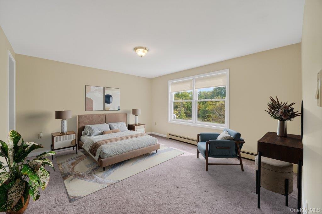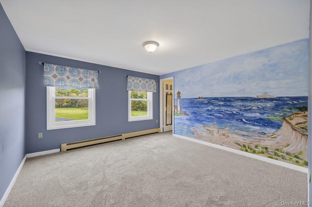 - Carpeted spare room with a baseboard heating unit and wallpapered walls