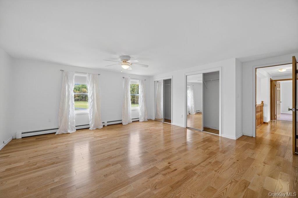 - Unfurnished bedroom featuring two closets, light wood finished floors, ceiling fan, and a baseboard heating unit