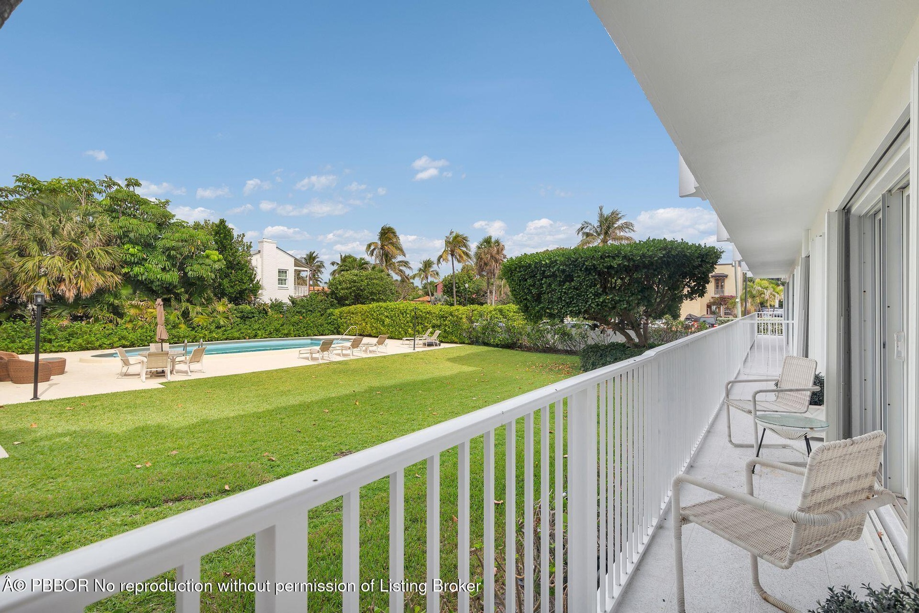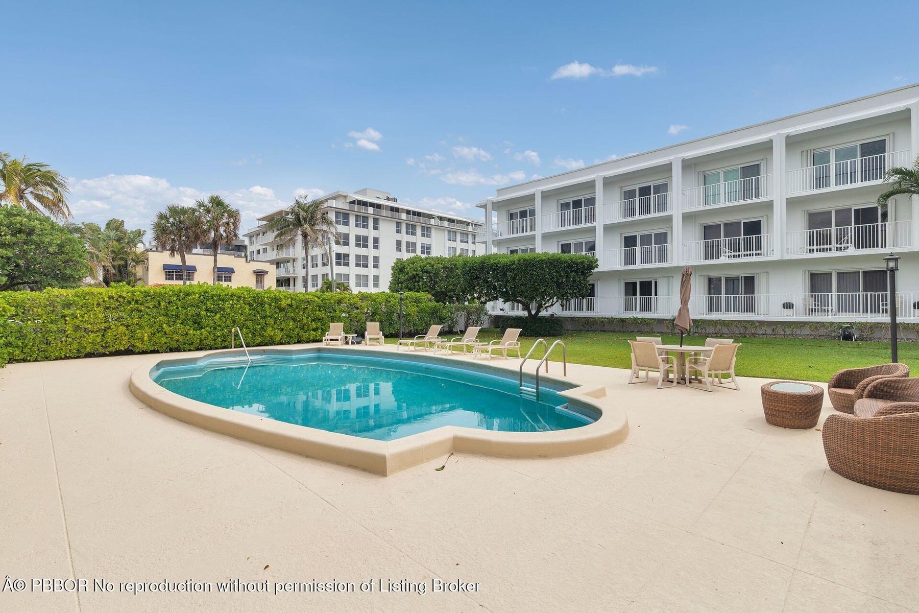 Experience the best of coastal living in this spectacular ocean front boutique building in Palm Beach. This stunning 2 bedroom, 2 bath with views of the large heated, private pool from your balcony is ideally located across the street from Mid-Town Beach and only two blocks from Worth Avenue. This first-floor turnkey end unit has tile throughout while offering a private view from each room to the pool and lush landscaping. The newly renovated lobby and hallways exude modern elegance. You are also surrounded by lush landscaping with serene outdoor seating. Residents also have access to a brand-new gym and the convenience of a doorman service building. Additionally, the Three Fifty Condo is pet friendly. The perfect Palm Beach pied-a-terre awaits, with one of the lowest HOA on the island!