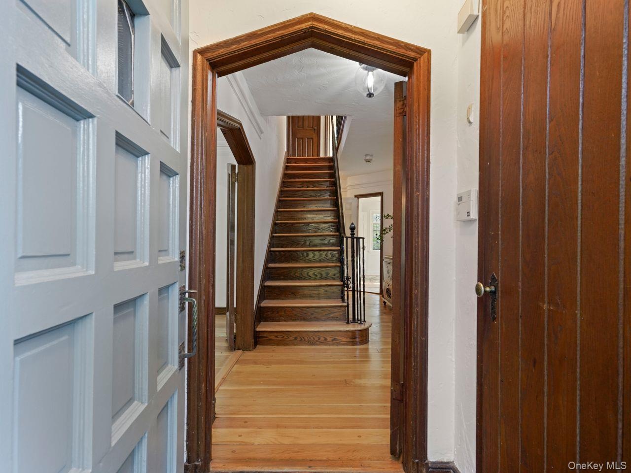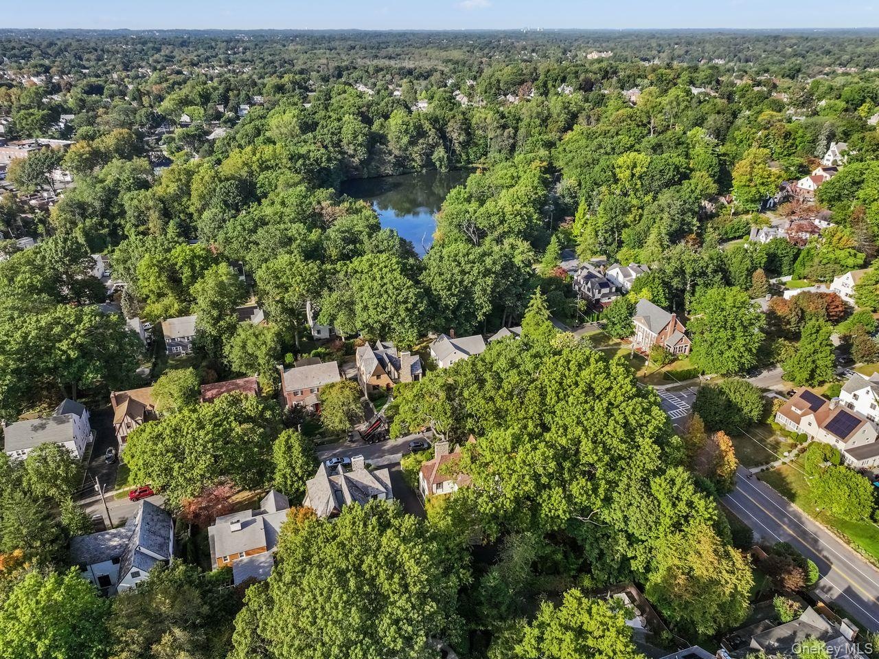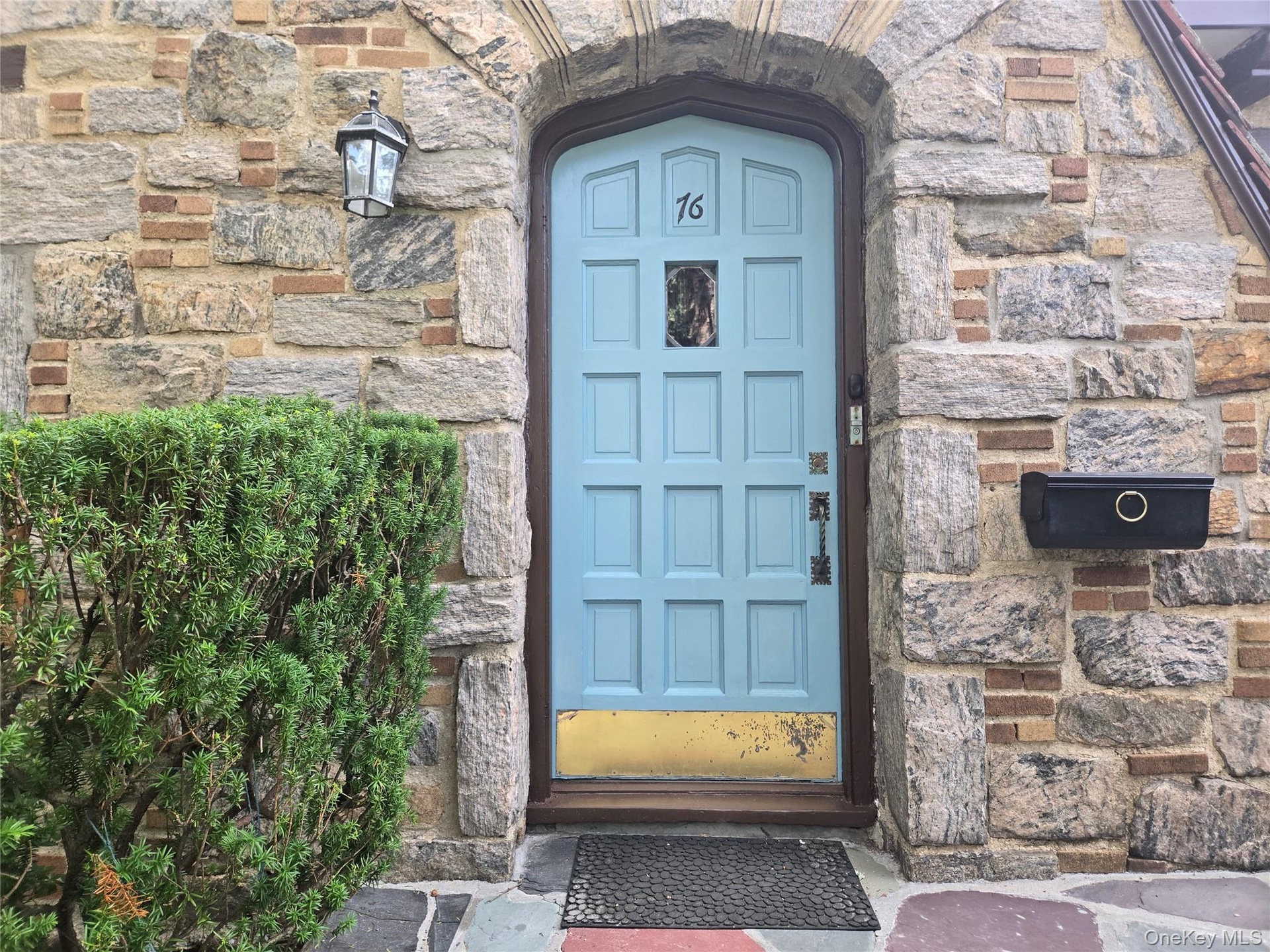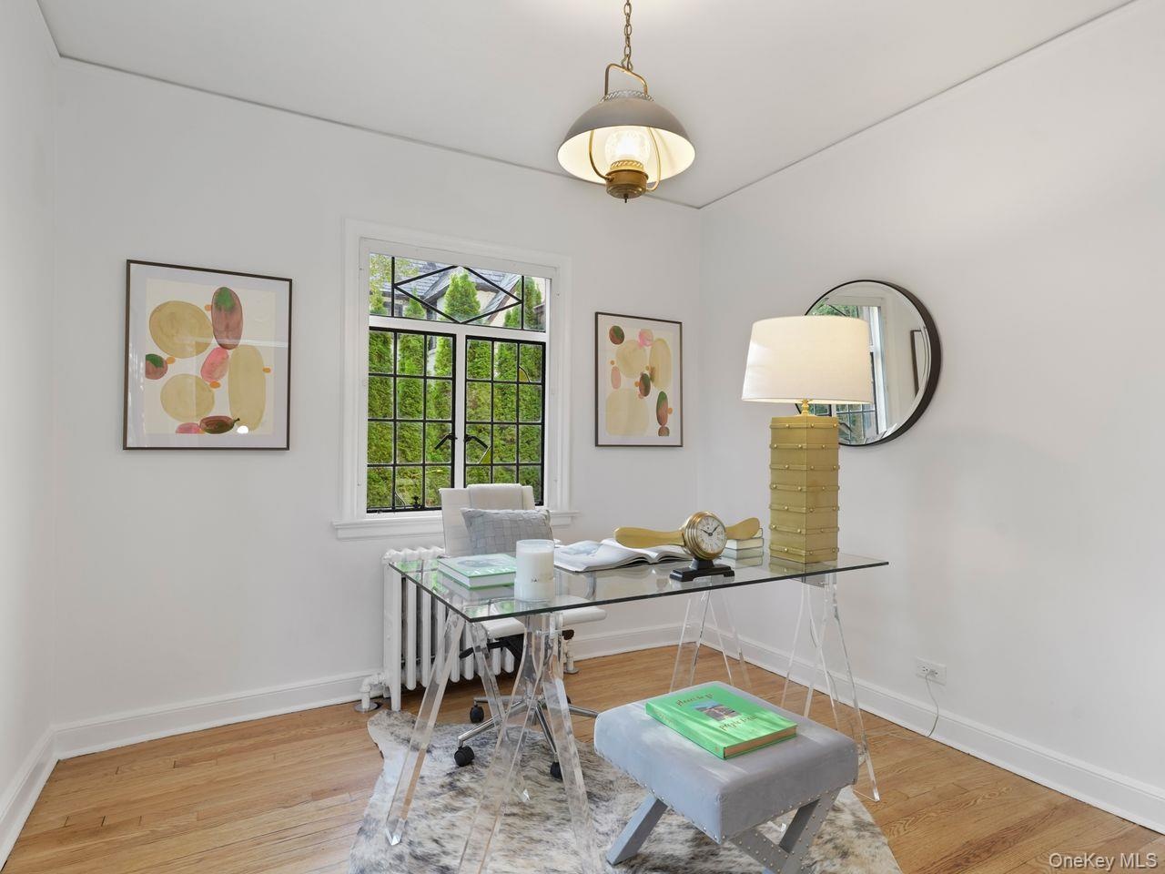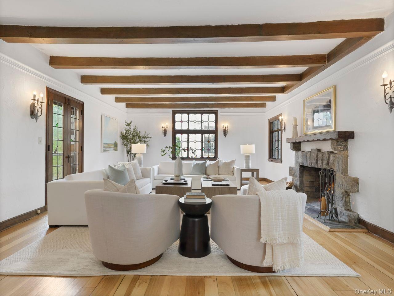 CASTLE ON THE HILL – Welcome to 76 Vaughn, your nearly 3,000 sf, 5-bedroom Tudor home where old world charm meets modern conveniences. It is within close proximity to the National School of Excellence, Daniel Webster, one block to the serene Glenwood Lake & most delightfully it is a 15 minute walk to the Pelham Metro North Train station giving you quick access to NYC. The primary suite features soaring 11-foot ceilings, period sconces, a spacious walk-in closet, & a luxurious ensuite bath with 2-person whirlpool tub, two sinks, and stand-alone glass shower. 3 additional bedrooms share a full bath on the 2nd floor, while the main floor offers a versatile office/den/bedroom with an adjacent half bath (originally a full bath, plumbing intact for easy conversion). The living and dining rooms are bathed in natural light through large windows and French doors, with a wood-burning fireplace in the huge living room and hardwood floors adding warmth throughout. The dining room easily accommodates 12 or more guests, flowing naturally into the eat-in kitchen with granite-topped island seating for four, abundant counter space, beverage nook, & pantry with pull-out, self-closing drawers—ideal for both everyday living and entertaining. The garden level provides a brand-new high-efficiency boiler with a 10-year warranty, water heater, brand-new front-loading washer, a dryer, potential for a powder room, & a large, finished family room with stained-glass windows, a surround-sound system, a second wood-burning fireplace, and generous storage. Adorned with classic Tudor details, the home boasts exposed nine-foot beamed ceilings, cedar closets, casement leaded-glass windows with decorative stained-glass accents, stucco walls, a pitched Spanish tile roof, and wrought-iron banisters. Modern updates include stainless-steel appliances (Bosch dishwasher, GE refrigerator, stove & microwave), seamlessly blending old-world charm with contemporary comfort. Outdoor living is just as inviting. French doors open onto a charming back terrace featuring a remote-controlled retractable Sun Setter awning, two cherry blossom trees, plenty of space for alfresco dining, and a hilltop view of a beautiful yard adorned with perennials and annuals as well as the surrounding neighborhood, while a front slate patio overlooks a perennial garden offering shade and additional hilltop views. Highlights include 2 fireplaces (living room & family room), paved terraces in both front and back, and a gently curved shared driveway leading to a two-car garage. Homeownership includes co-ownership of a shared snow blower with neighbors. 76 Vaughn combines modern convenience with timeless Tudor elegance—perfect for gathering, entertaining, or simply relaxing in your private hilltop retreat. There is nothing to do but drop your bags and just live!