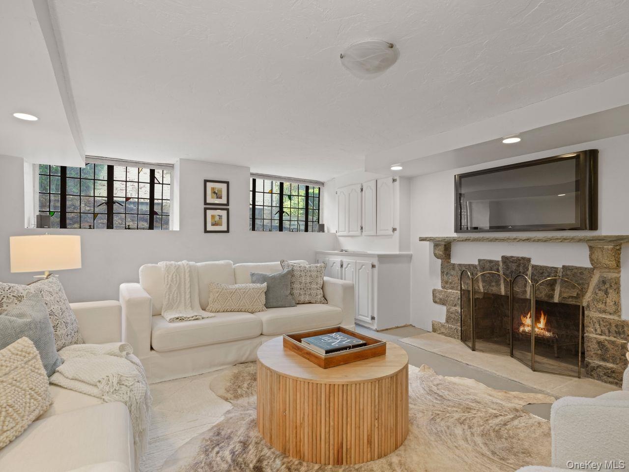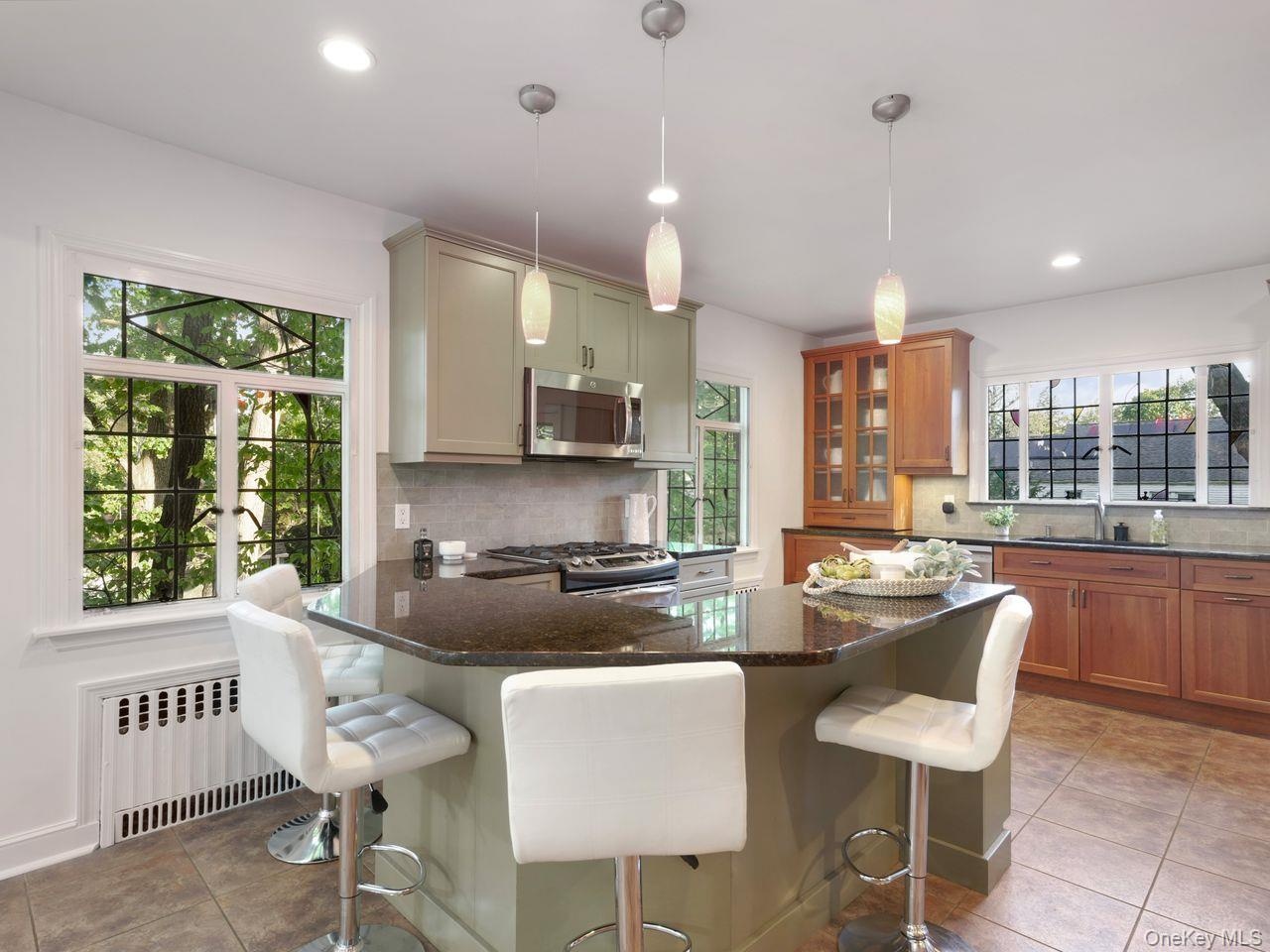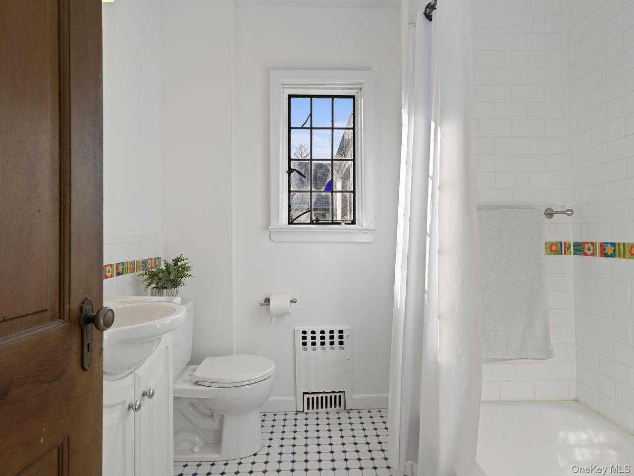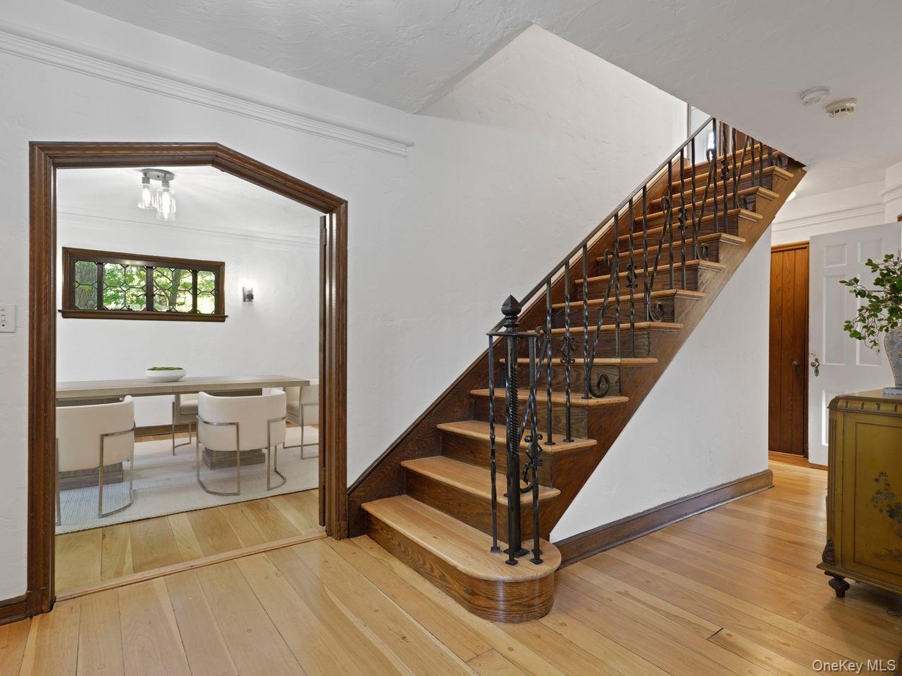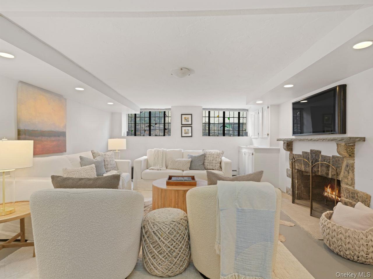 CASTLE ON THE HILL – Welcome to 76 Vaughn, your nearly 3,000 sf, 5-bedroom Tudor home where old world charm meets modern conveniences. It is within close proximity to the National School of Excellence, Daniel Webster, one block to the serene Glenwood Lake & most delightfully it is a 15 minute walk to the Pelham Metro North Train station giving you quick access to NYC. The primary suite features soaring 11-foot ceilings, period sconces, a spacious walk-in closet, & a luxurious ensuite bath with 2-person whirlpool tub, two sinks, and stand-alone glass shower. 3 additional bedrooms share a full bath on the 2nd floor, while the main floor offers a versatile office/den/bedroom with an adjacent half bath (originally a full bath, plumbing intact for easy conversion). The living and dining rooms are bathed in natural light through large windows and French doors, with a wood-burning fireplace in the huge living room and hardwood floors adding warmth throughout. The dining room easily accommodates 12 or more guests, flowing naturally into the eat-in kitchen with granite-topped island seating for four, abundant counter space, beverage nook, & pantry with pull-out, self-closing drawers—ideal for both everyday living and entertaining. The garden level provides a brand-new high-efficiency boiler with a 10-year warranty, water heater, brand-new front-loading washer, a dryer, potential for a powder room, & a large, finished family room with stained-glass windows, a surround-sound system, a second wood-burning fireplace, and generous storage. Adorned with classic Tudor details, the home boasts exposed nine-foot beamed ceilings, cedar closets, casement leaded-glass windows with decorative stained-glass accents, stucco walls, a pitched Spanish tile roof, and wrought-iron banisters. Modern updates include stainless-steel appliances (Bosch dishwasher, GE refrigerator, stove & microwave), seamlessly blending old-world charm with contemporary comfort. Outdoor living is just as inviting. French doors open onto a charming back terrace featuring a remote-controlled retractable Sun Setter awning, two cherry blossom trees, plenty of space for alfresco dining, and a hilltop view of a beautiful yard adorned with perennials and annuals as well as the surrounding neighborhood, while a front slate patio overlooks a perennial garden offering shade and additional hilltop views. Highlights include 2 fireplaces (living room & family room), paved terraces in both front and back, and a gently curved shared driveway leading to a two-car garage. Homeownership includes co-ownership of a shared snow blower with neighbors. 76 Vaughn combines modern convenience with timeless Tudor elegance—perfect for gathering, entertaining, or simply relaxing in your private hilltop retreat. There is nothing to do but drop your bags and just live!