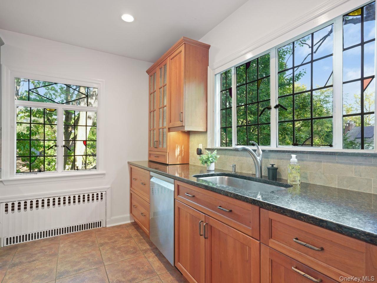- Kitchen featuring radiator heating unit, tasteful backsplash, dark stone countertops, glass insert cabinets, and stainless steel dishwasher