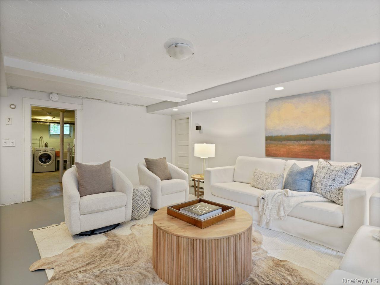 - Family room featuring washer / clothes dryer, recessed lighting, and beam ceiling