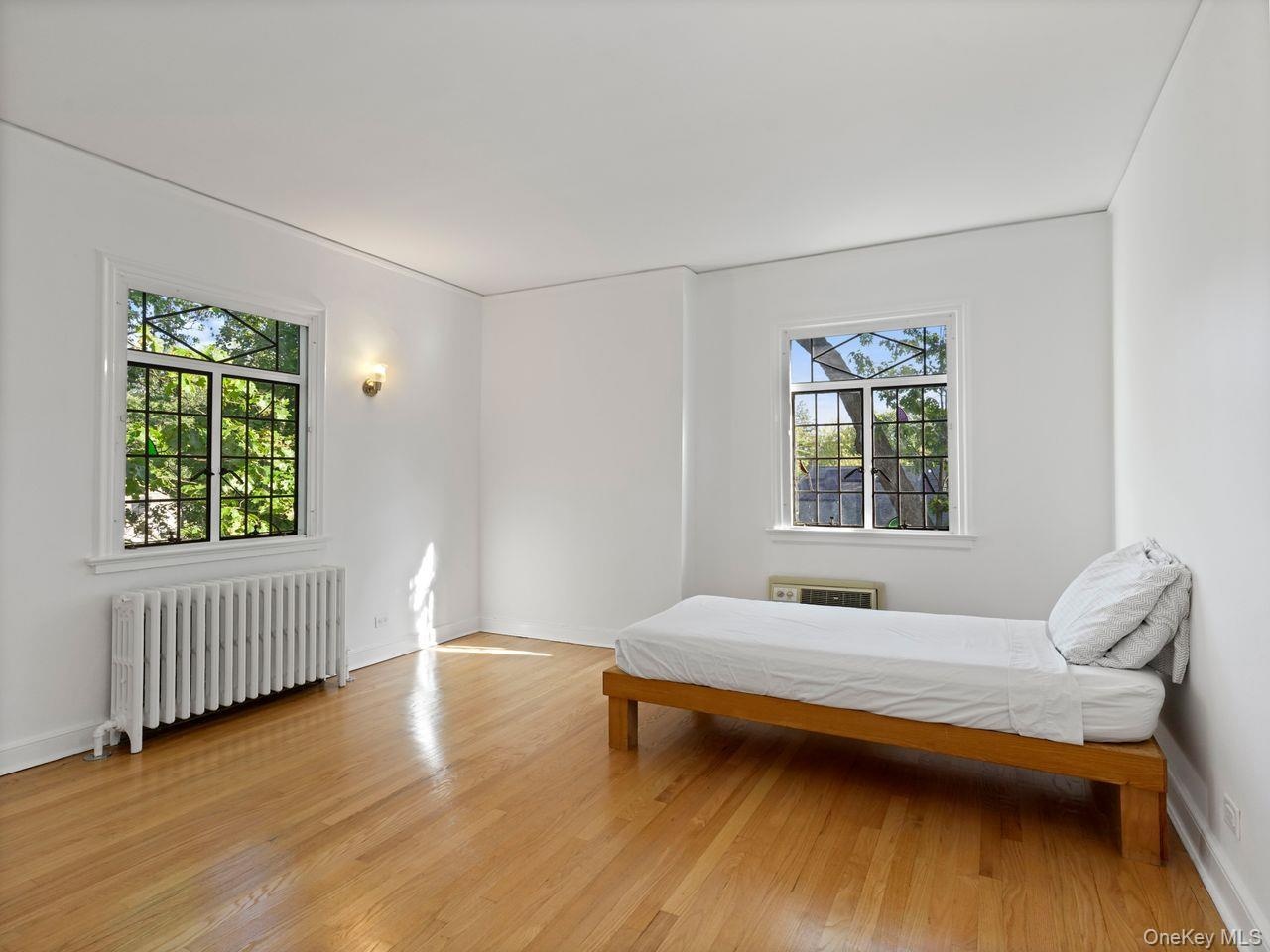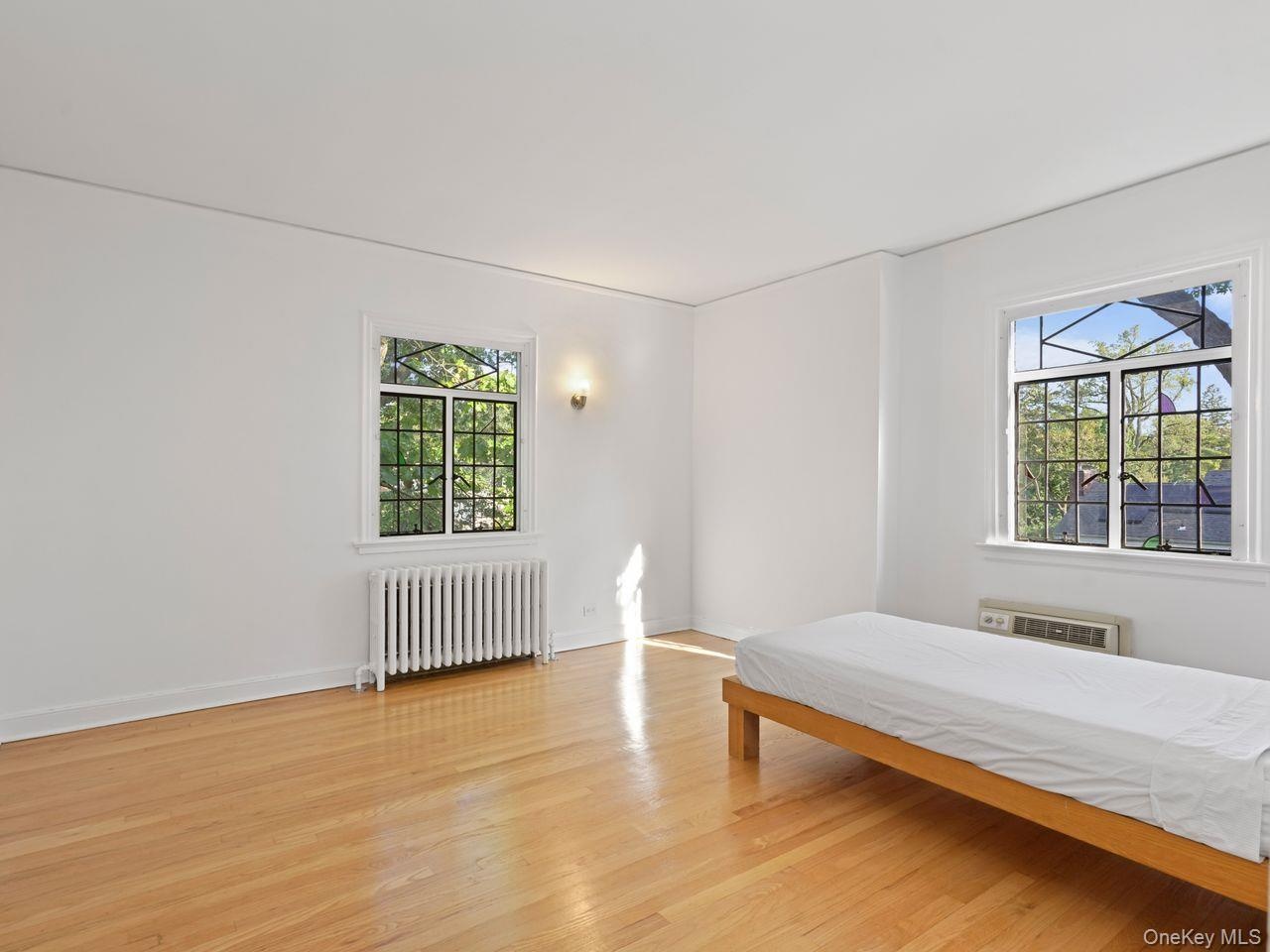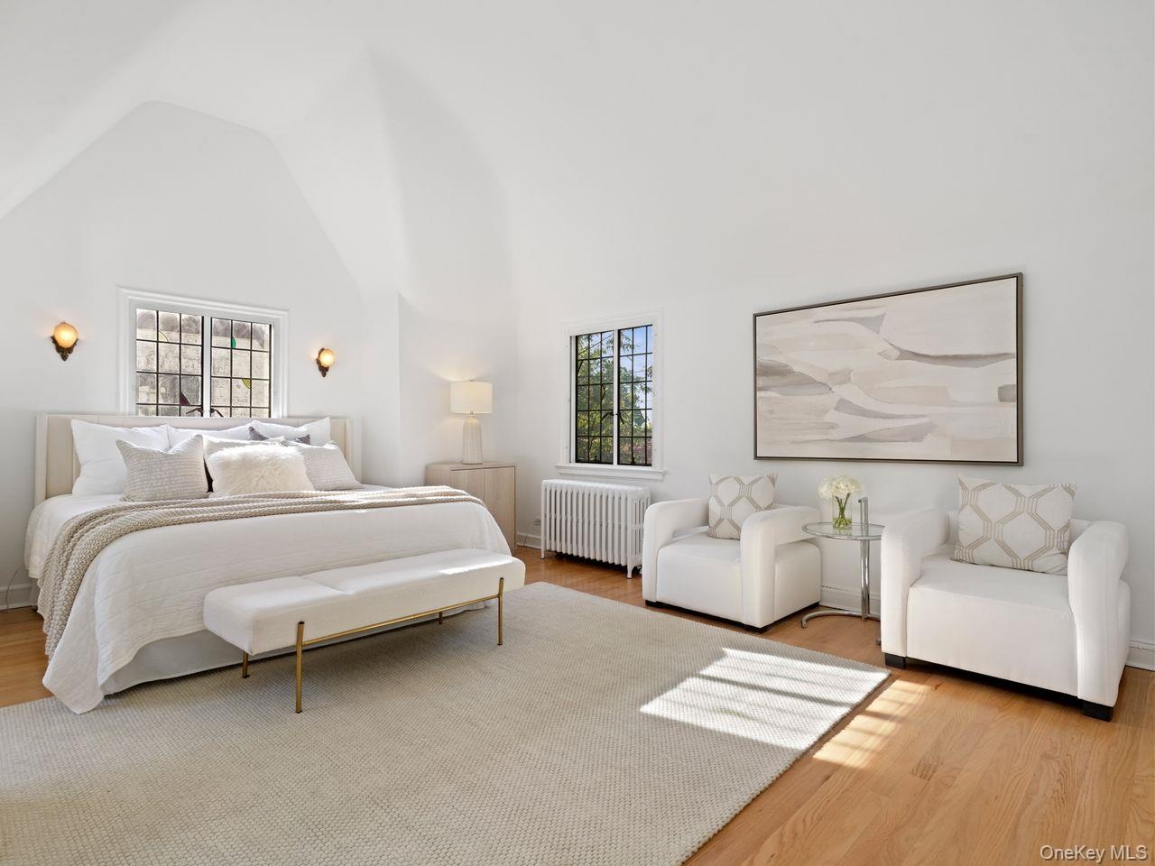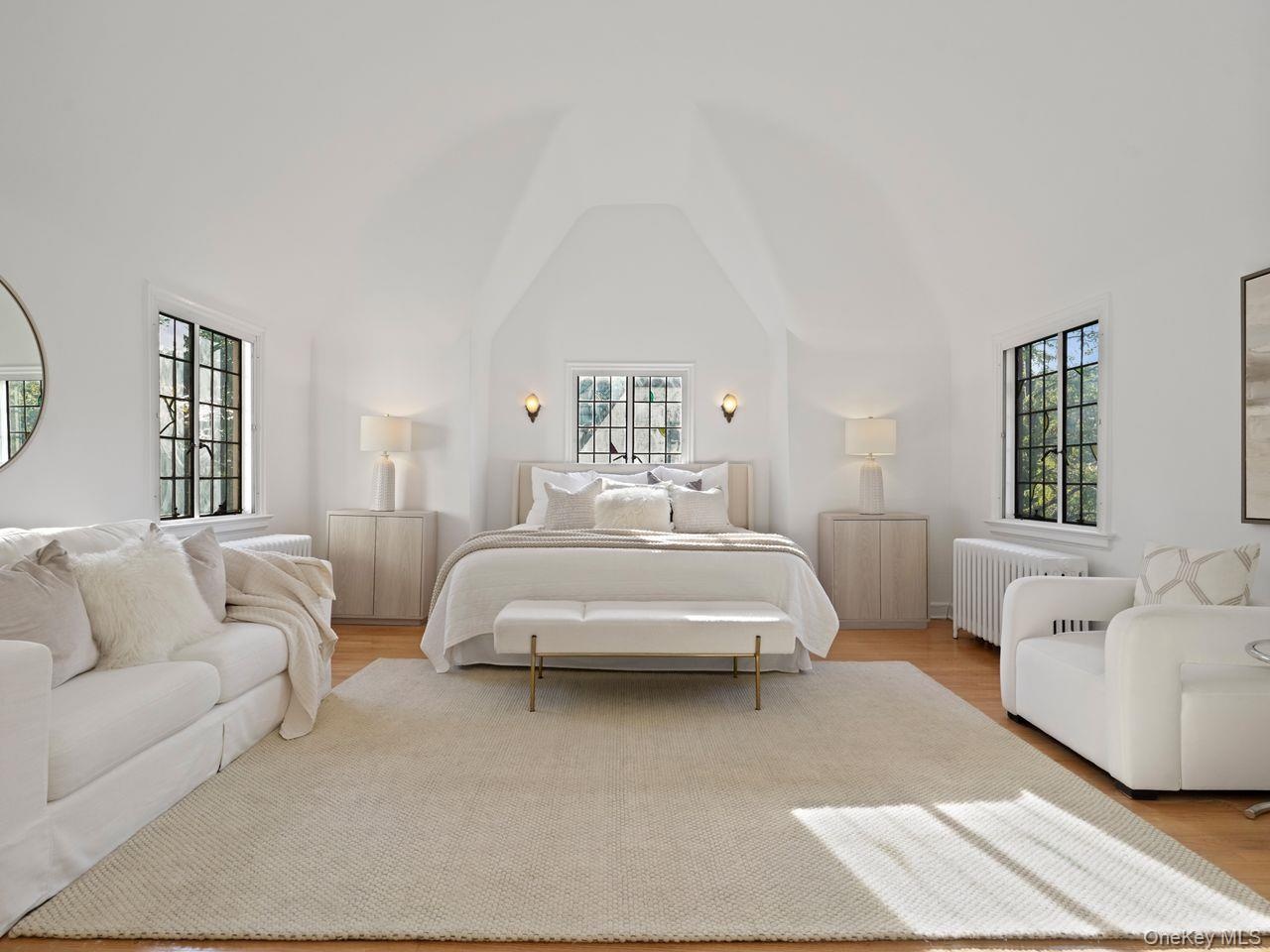 - Primary bedroom with wood finished flooring, leaded & stained glass windows, radiator, and vaulted ceiling
